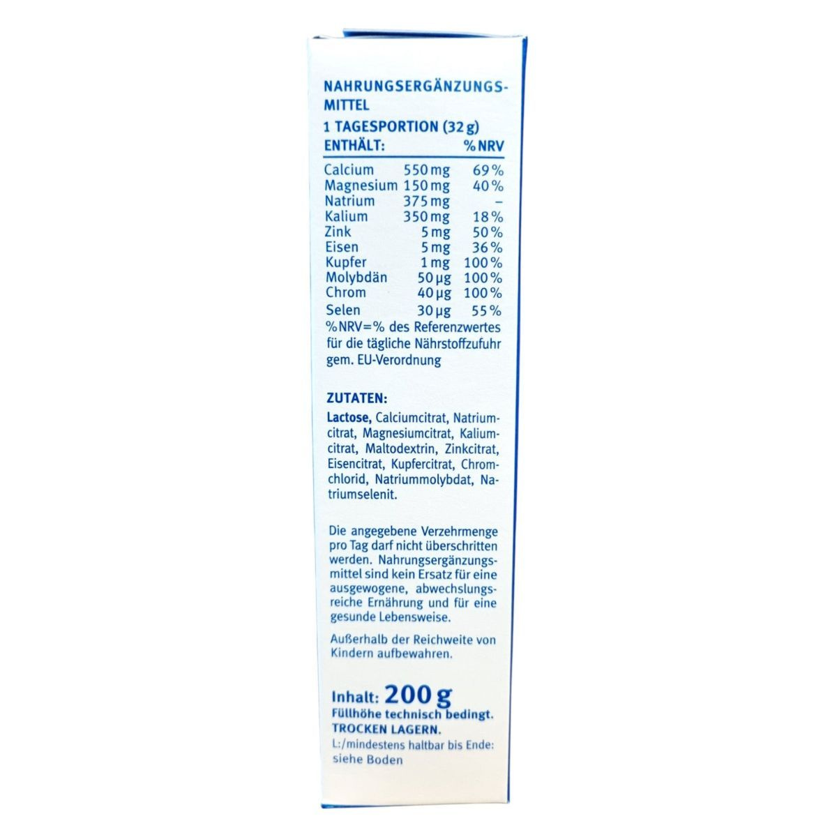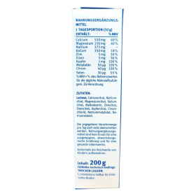 laktóz, kalcium-citrát, nátrium-citrát, magnézium-citrát, kálium-citrát, maltodextrin, cink-citrát, vas-citrát, réz-citrát, króm-klorid, nátrium-molibdát, nátrium-szelenit