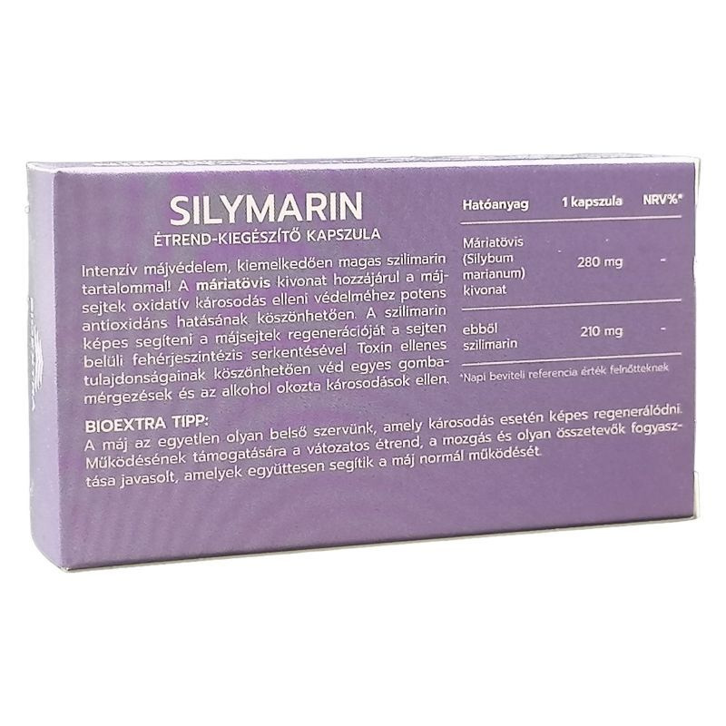 Hatóanyaga, a szilimarin védi a májat a toxikus anyagokkal szemben, lassítja a májkárosodást és gyorsítja a szövetek regenerációját. Alkalmazható gyógyszeres terápia kiegészítésére, támogatja a méregtelenítő kúra eredményességét. A Bioextra Silymarin kapszula a Májbetegekért Alapítvány ajánlásával rendelkezik és a lehető legmagasabb szilimarin tartalmú étrend-kiegészítő készítmény. Összetevők: máriatövis kivonat, maltodextrin, zselatin, térfogatnövelő (kukoricakeményítő), poliszorbát 80, csomósodás gátló (megnézium-sztearát), színezék (vörös vas-oxid, titán-dioxid). Hatóanyag a napi adagban: 280 mg máriatövis kivonat, ebből 210 mg szilimarin/ 1 kapszula. Notifikációs szám: 7781/2010.