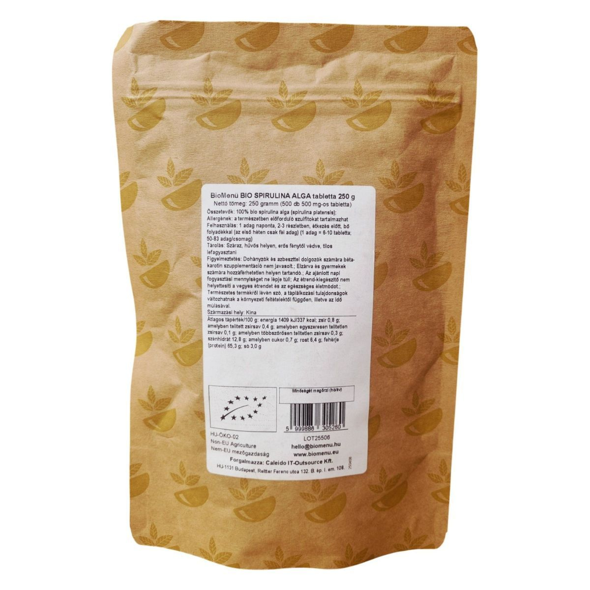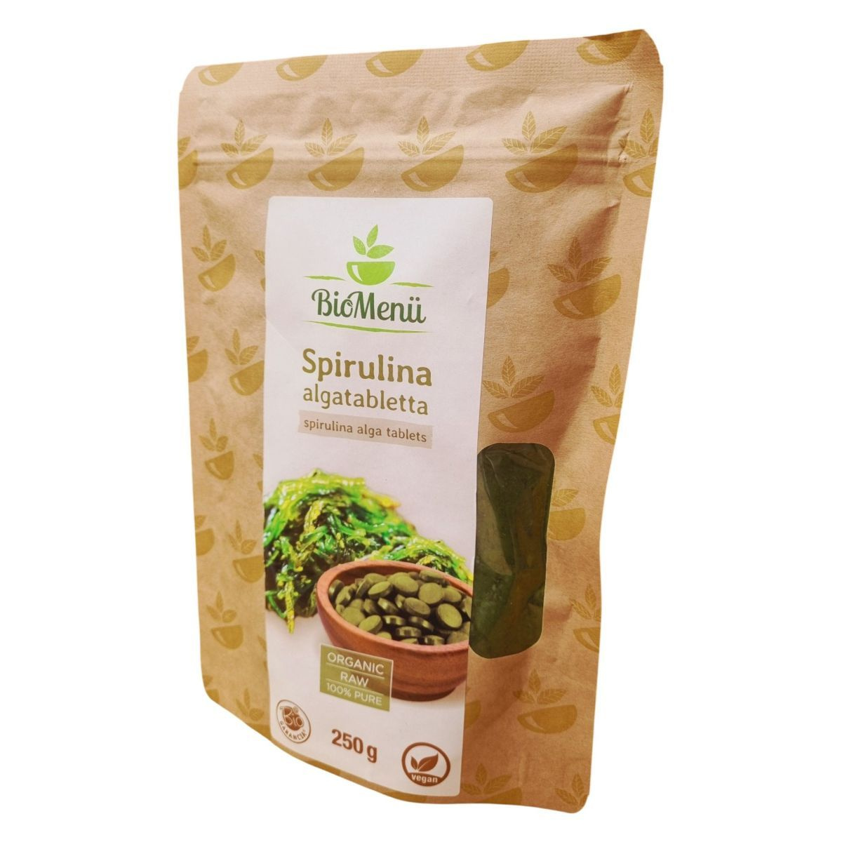A BioMenü Spirulina algatabletta 250 g-os kiszerelésben kapható, amely 500 db 500 mg-os tablettát tartalmaz. A termék 100% bio spirulina algát tartalmaz, amely Kínából származik. A spirulina alga gazdag fehérjében és rostban, valamint alacsony zsírtartalommal rendelkezik. Az étrend-kiegészítő bio, raw és vegán minősítéssel rendelkezik, így különböző étrendi irányzatokba is beilleszthető. A termék fogyasztása során fontos, hogy az ajánlott napi mennyiséget ne lépjük túl, és tartsuk be a tárolási előírásokat. A termék minőségét a HU-ÖKO-02 tanúsítvány garantálja.