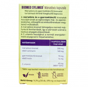 A biomed® SYLIMED® Máriatövis kapszula máriatövis és gyermekláncfű kivonatot tartalmaz, amelyek hozzájárulhatnak az egészséges máj- és epeműködéshez, valamint támogathatják az emésztőrendszer megfelelő működését. A C-vitamin segíthet a normál energiatermelő anyagcsere-folyamatok fenntartásában.