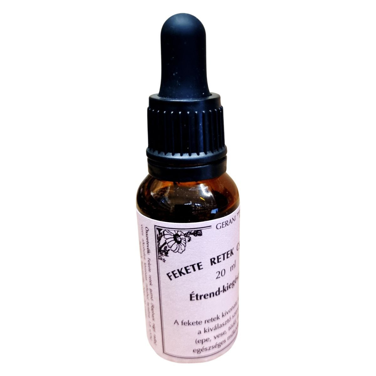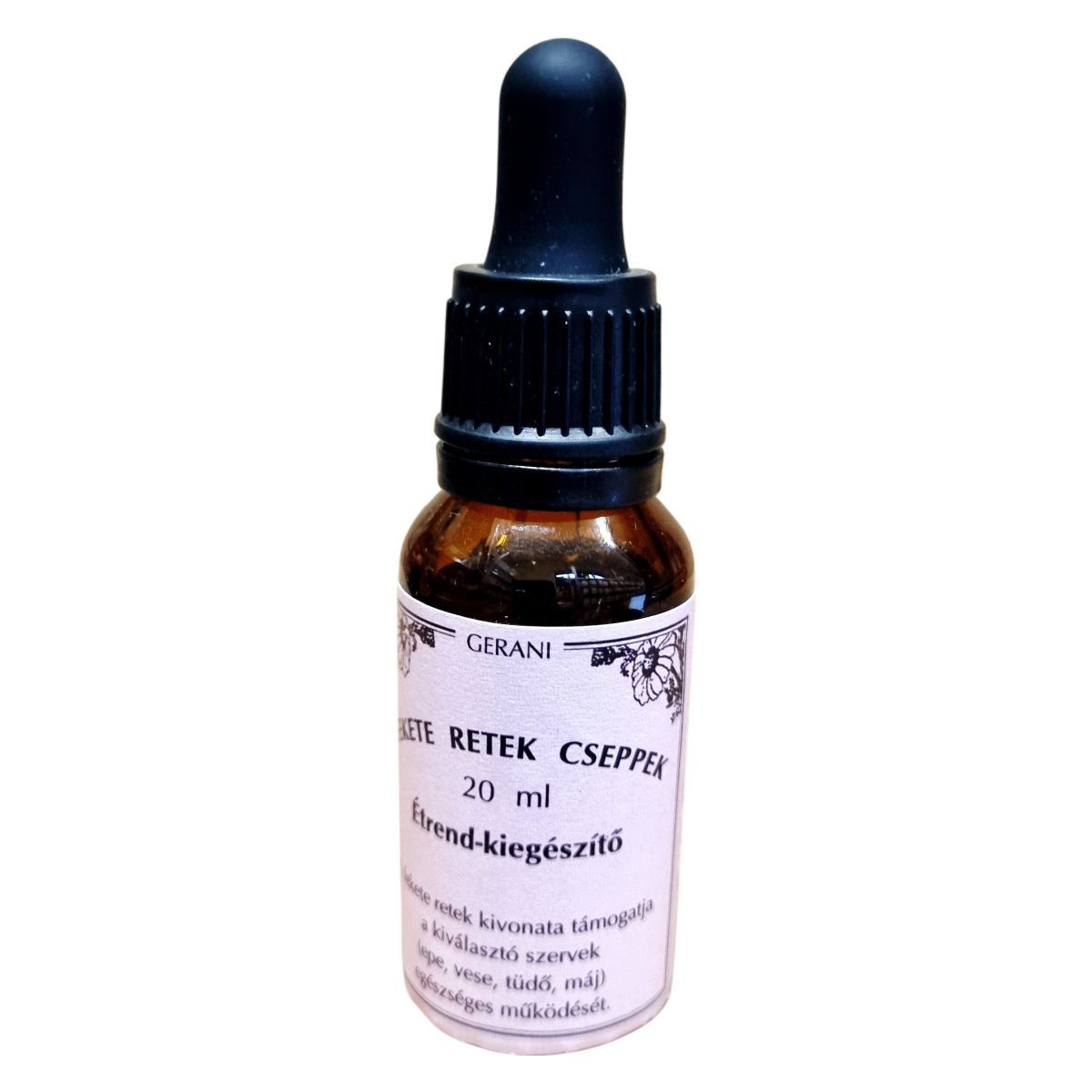 A Gerani Fekete Retek Cseppek egy étrend-kiegészítő, amely a fekete retek gumójának vizes alkoholos kivonatát tartalmazza. Az alkohol tartalma 1,8 % v/v. A termék napi adagja 1714 mg, amely megfelel 17,1 g friss fekete retek gumónak vagy 12,8 g friss retek préslének. A fekete retek kivonata támogathatja a kiválasztó szervek, mint az epe, vese, tüdő és máj egészséges működését. A terméket napfénytől védve, gyermekektől elzárva, szobahőmérsékleten kell tárolni. A gyártó és forgalmazó a Gerani Rel Kft., és a termék OÉTI engedélyszáma 10038/2011.