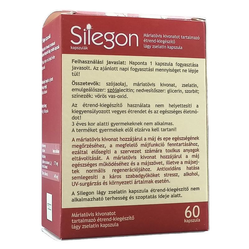 Felhasználási javaslat: Naponta 1-2 kapszula fogyasztása javasolt. Az ajánlott napi fogyasztási mennyiséget ne lépje túl! Összetevők: szójaolaj, máriatövis kivonat, zselatin, lecitin, nedvesítőszer: glicerin, színezék: titán-dioxid, nedvesítőszer: szorbitol, színezékek: fekete vas-oxid, vörös vas-oxid.