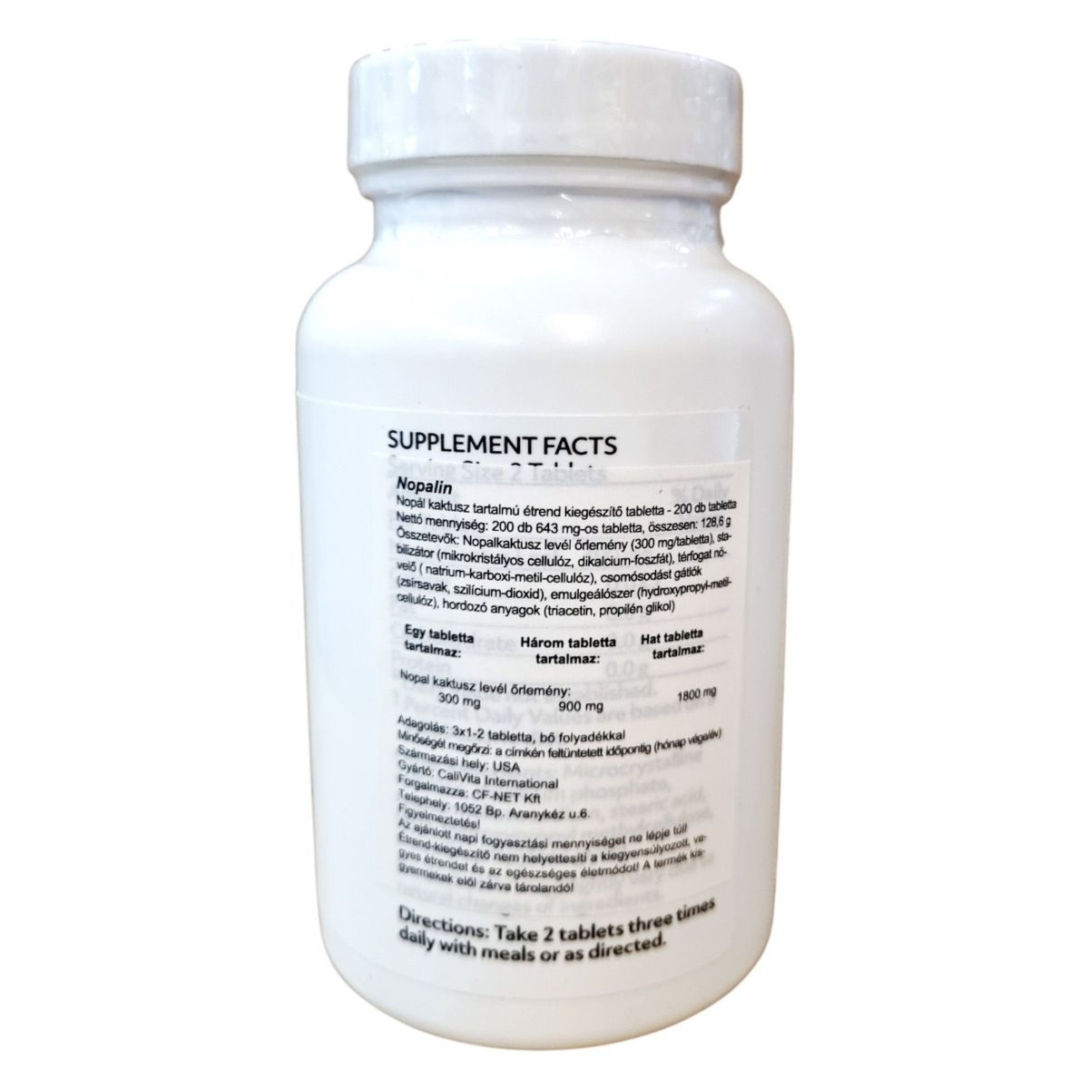 A Nopalin étrend-kiegészítő tabletta a CaliVita International terméke, amely nopal kaktusz levél őrleményt tartalmazhat. A termék 200 db, egyenként 643 mg-os tablettát tartalmaz, összesen 128,6 g nettó mennyiségben. A gyártás az USA-ban történik, a legszigorúbb minőségi előírásoknak megfelelően. A termék célja, hogy támogassa az egészséges életmódot, de nem helyettesíti a vegyes étrendet. A forgalmazó a CF-NET Kft, telephelye Budapesten található.