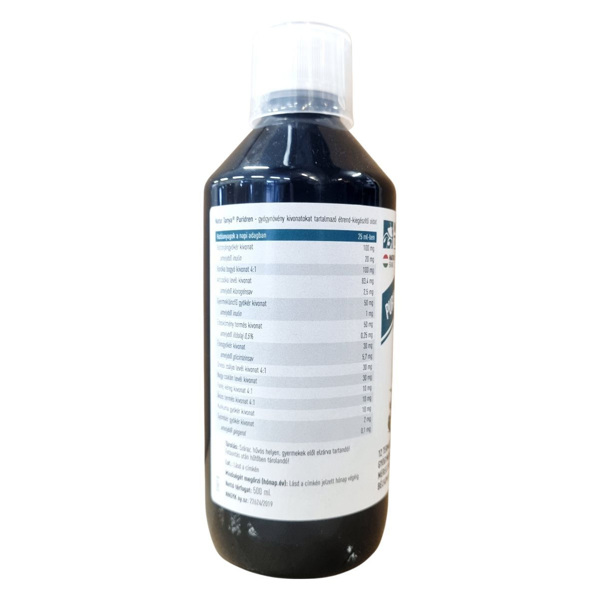 A Natur Tanya® Puridren egy természetes gyógynövénykivonatokat tartalmazó étrend-kiegészítő oldat, amely 12 különböző gyógynövény komplex keverékét tartalmazza. Ezek közül az articsóka kivonat különösen hozzájárulhat a méregtelenítéshez és a bélkomfort támogatásához. A készítmény tartalmaz több standardizált kivonatot, mint például a borókabogyó, orvosi zsálya, fahéj és gyömbér kivonatokat, melyek hatóanyagai pontos mennyiségekben vannak megadva. Az adagolási javaslat napi 25 ml folyadék elfogyasztása, minimum 60 naptól maximum 120 napig, hosszú távon is biztonságosan használható. A termék vegán és nem tartalmaz mesterséges aromát, továbbá 100%-ban magyar tulajdonú cég által kerül forgalomba. A termék használata során fontos a felrázás, valamint az ajánlott napi mennyiség betartása. A termék nem helyettesíti a kiegyensúlyozott étrendet és egészséges életmódot, valamint túlérzékenység esetén nem javasolt a szedése.