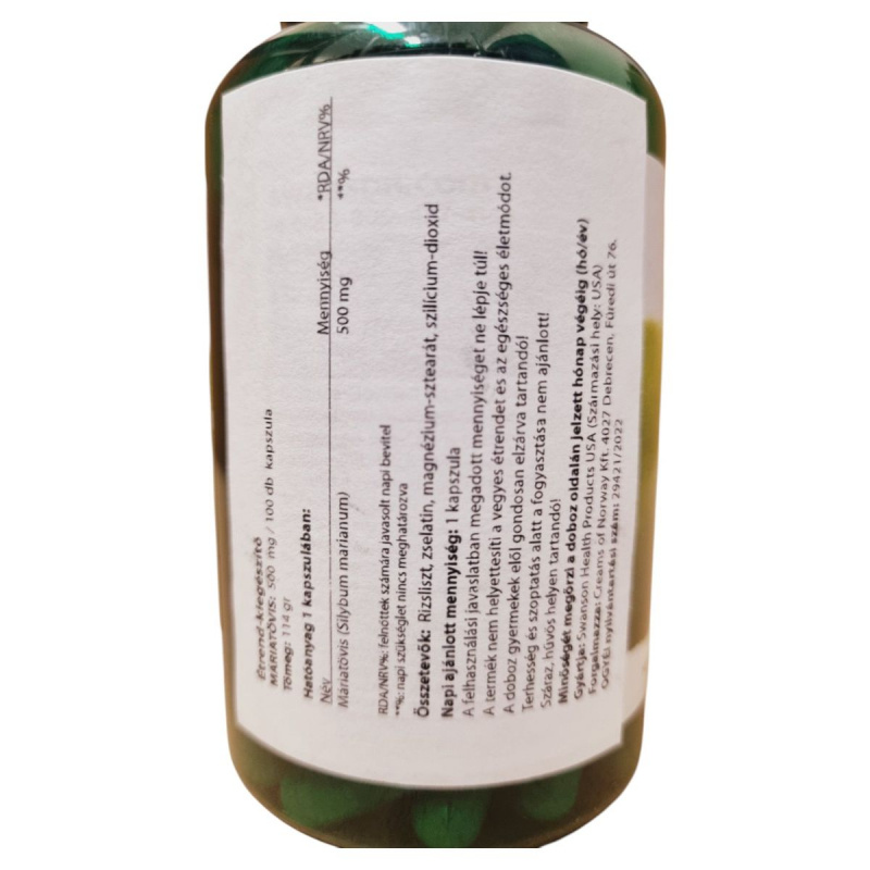 A Swanson Máriatövis étrend-kiegészítő 500 mg máriatövis kivonatot tartalmaz kapszulánként, amely hozzájárulhat a máj egészségének támogatásához. A termék rizslisztet, zselatint, magnézium-sztearátot és szilícium-dioxidot tartalmaz. A napi ajánlott mennyiség 1 kapszula, amelyet nem szabad túllépni. A termék nem helyettesíti a vegyes étrendet és az egészséges életmódot, és gyermekek elől elzárva tartandó. Terhesség és szoptatás alatt a fogyasztása nem ajánlott. A terméket száraz, hűvös helyen kell tárolni. A gyártó Swanson Health Products, a forgalmazó pedig a BioTech USA Kft. Az OGYÉI nyilvántartási száma 9421/2022.