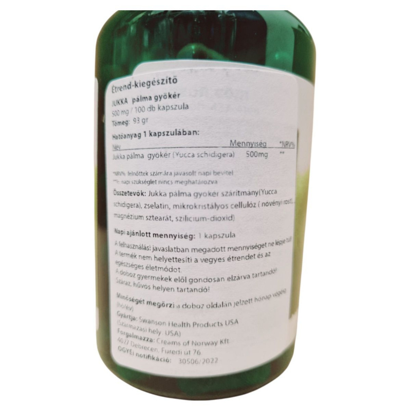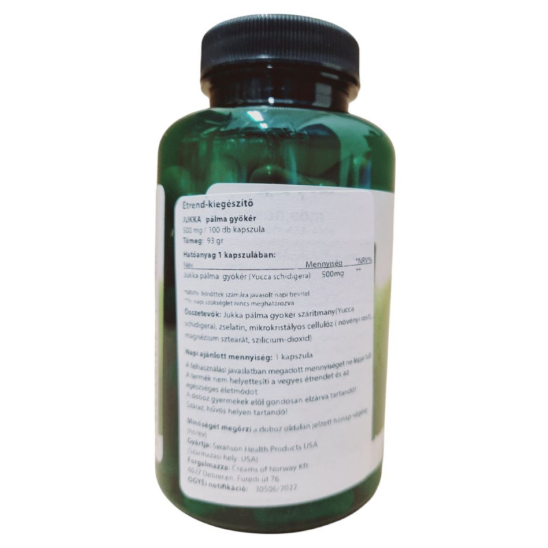 A JUKKA pálma gyökér kapszula a Yucca schidigera gyökerének szárítmányát tartalmazza, amelyet hagyományosan az egészség támogatására használnak. A termék 500 mg hatóanyagot tartalmaz kapszulánként, és napi egy kapszula fogyasztása javasolt. Az összetevők között található zselatin, mikrokristályos cellulóz, magnézium sztearát és szilícium-dioxid. A termék nem helyettesíti a vegyes étrendet és az egészséges életmódot, és fontos, hogy a javasolt napi mennyiséget ne lépjük túl. A kapszulákat száraz, hűvös helyen kell tárolni, és gyermekek elől elzárva tartani. A terméket a Swanson Health Products gyártja, és a Creams of Norway Kft. forgalmazza Magyarországon.