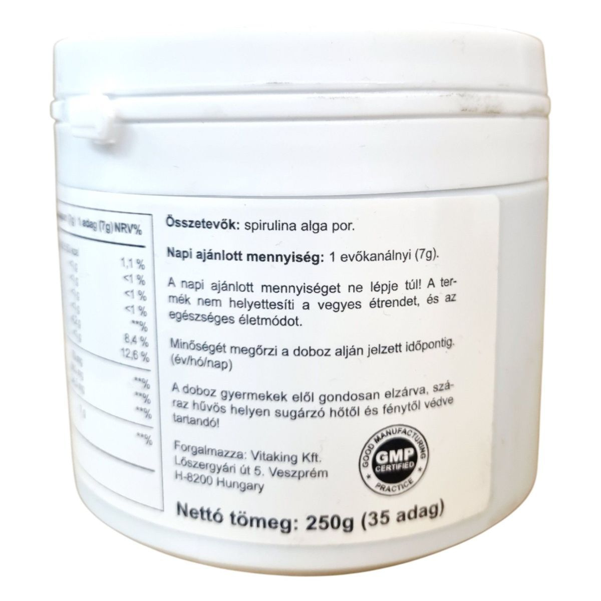 A Vitaking Spirulina Powder egy fitonutriensekben gazdag étrend-kiegészítő, amely 250 grammos kiszerelésben kapható. A termék fő összetevője a spirulina alga por, amely természetes forrása lehet a klorofilnak, polipeptideknek és karotinoidoknak. A termék napi ajánlott mennyisége 1 evőkanálnyi (7g), amelyet nem szabad túllépni. A termék nem helyettesíti a vegyes étrendet és az egészséges életmódot. Tárolása száraz, hűvös helyen javasolt, gyermekektől elzárva. Forgalmazza a Vitaking Kft., székhelye Veszprémben található.