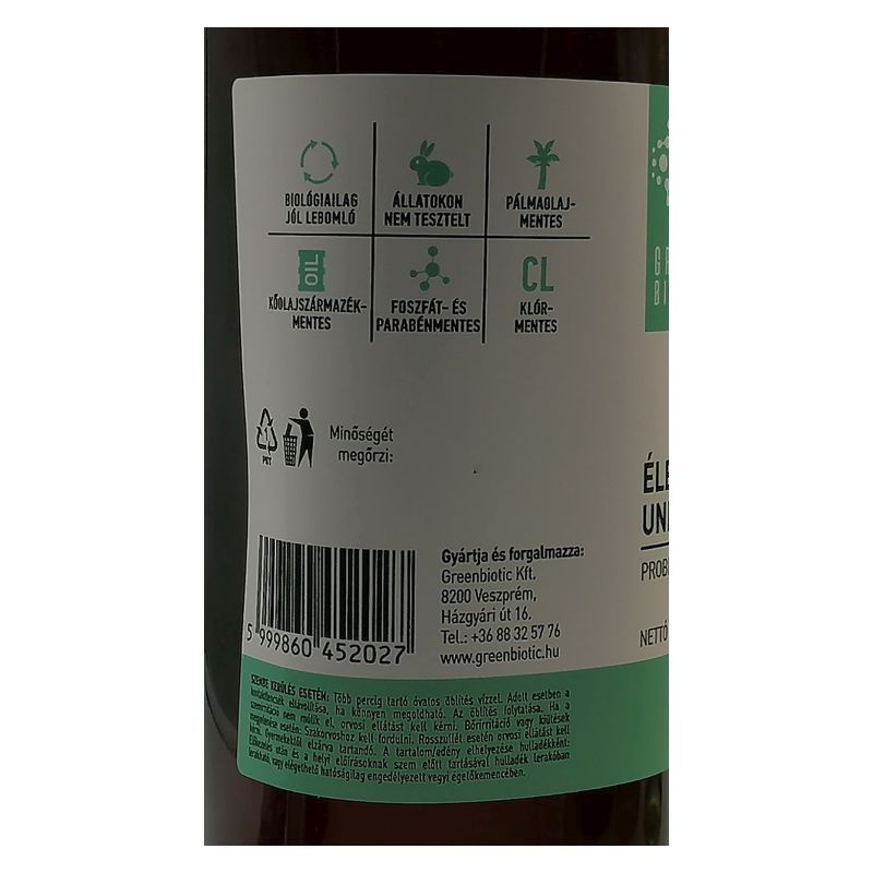 Összetevők: Probiotikus eredetű nemionos bio felületaktív anyag <5%, kókuszzsírsavak-káliumsói 15-25%, illatanyag.