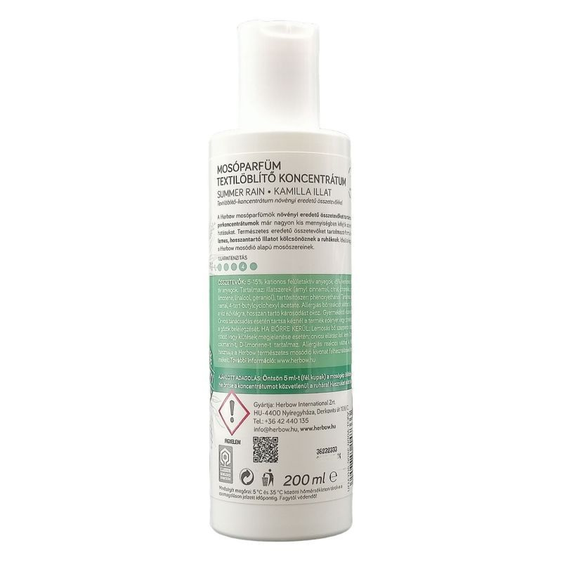 Növényi bázisú textilöblítő-szuperkoncentrátum a frissítő nyári záporok áztatta kamilla mezők nyarat idéző hangulatának üde, mámoros illatával.