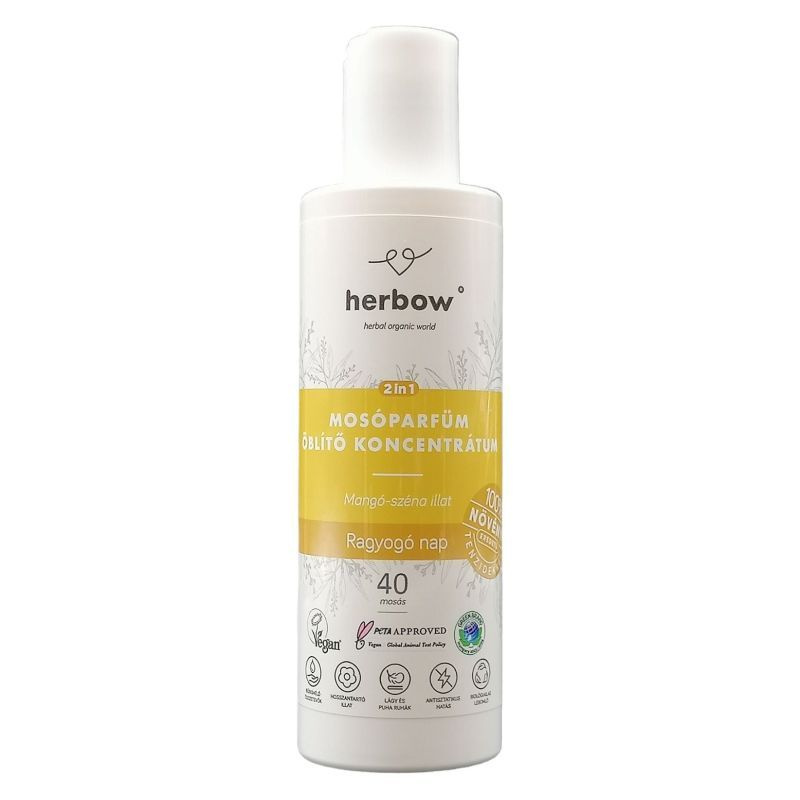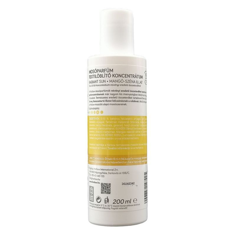 Növényi bázisú textilöblítő-szuperkoncentrátum a gyümölcsös és virágos jegyek összhangja, a mangó és a frissen kaszált széna illatának harmonikus egyensúlyával.