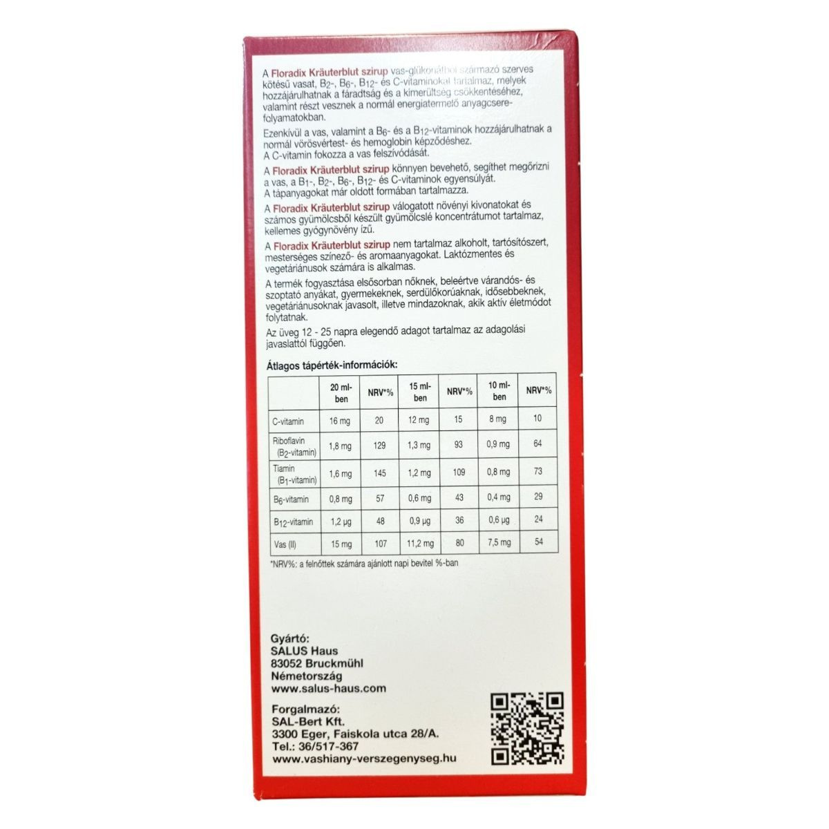A Salus Floradix Kräuterblut szirup válogatott növényi és gyümölcs-kivonatokon alapuló, vasat és többféle B-vitamint, valamint C-vitamint tartalmazó étrend-kiegészítő, amely segíthet a fáradtság és kimerültség csökkentésében, és hozzájárulhat a normál vérképzéshez. Kellemes gyümölcsös ízének és könnyen fogyasztható szirup formájának köszönhetően ideális nők, várandós és szoptató anyák, serdülők és idősebbek számára egyaránt. A termék tartósítószer-, színezék-, alkohol- és laktózmentes, vegetáriánus étrendbe is beilleszthető.