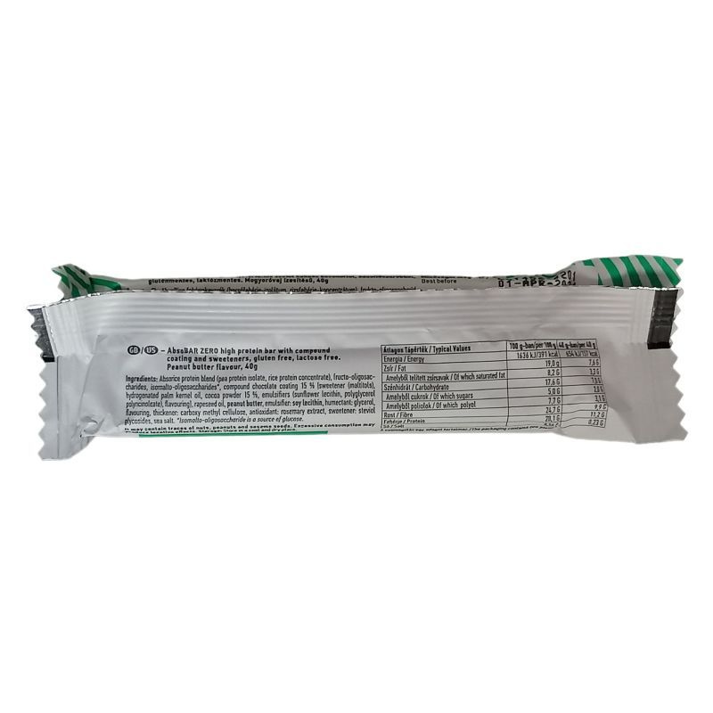 Miért különleges az AbsoBAR ZERO?Vegán, glutén és laktózmentes: a speciális étrenddel rendelkezők is fogyaszthatjákKiváló minőségű alapanyagokból készül: rizs- és borsóprotein felhasználásávalTeljes értékű fehérjeforrás: komplettált fehérjéből (tartalmaz minden aminosavat, amelyek a a szervezet számára nélkülözhetetlenek)Tartósítószer mentes: felesleges adalékagyagoktól mentes szeletMinimum 27% vegán proteint tartalmaz: szuper harapnivaló, ha edzés előtt/alatt/után rád tör az éhség, vagy csak ennél valami finomatAlacsony a cukortartalma: egy szelet kevesebb, mint 2g cukrot tartalmaz.Rostban gazdag: a megfelelő mennyiségű rostbevitel fontos a jól működő emésztéshez, és teltségérzetet is biztosít.