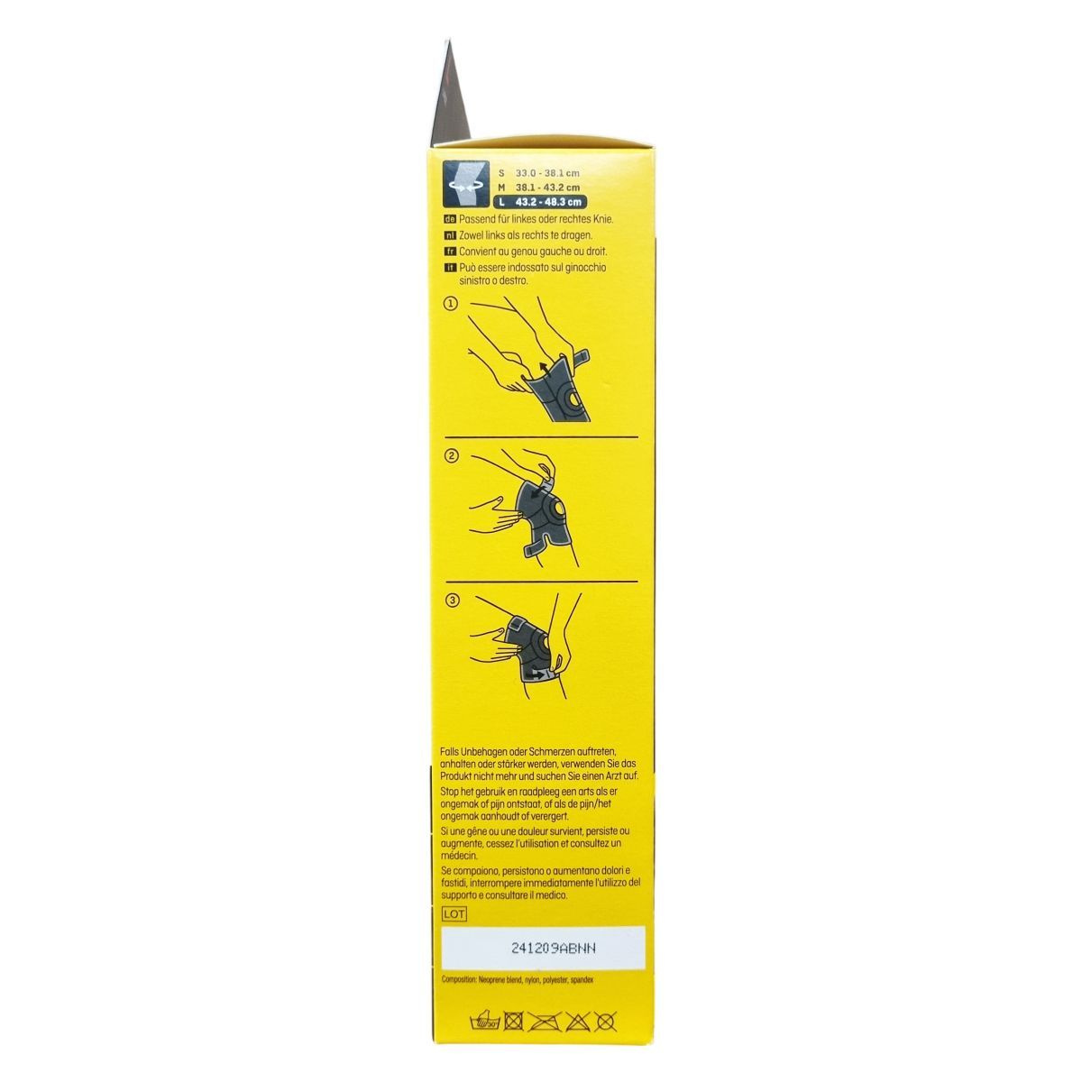 43 - 48 cm. Támaszt nyújt a merev, gyenge, sérült térdnek.