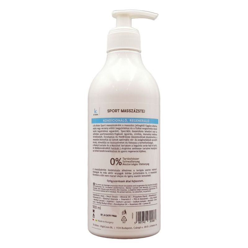 A Dr.Kelen Sport masszázskrémmel végzett masszázs önmagában vagy fizioterápiás kezeléseket kiegészítve megfelelő állapotban tartja a sportoló izomzatát, mozgásszerveit, sérülés esetén gyorsítja azok regenerálódását. A masszázskrém összetétele alkalmas a terápia szerint indokolt illóolajok és más aktív anyagok bőrbe juttatására is. A masszázst követően a bőr nem marad olajos, zsíros tapintású és igény esetén lemosható.