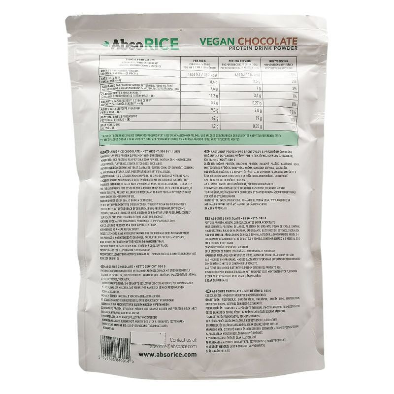 Jellemzően edzés mellett fogyasztják az izomnövekedés és a testzsír csökkentés elősegítésére. Fő alapanyaga a rizsfehérje és a borsófehérje, amelyek keveréke így teljes értékű, az állati fehérjékhez hasonló aminosav profilt biztosít. 100%-ban növényi eredetű, hipoallergén (laktóz és gluténérzékenyek is fogyaszthatják), GMO mentes, nem tartalmaz mesterséges édesítőszert (steviát használunk). Összetevők: rizsfehérje, borsófehérje, bambuszrost, aroma, karobpor, karboximetil-cellulóz, szteviol glikozidok. Felhasználási javaslat: 4 púpozott evőkanál (kb. 32 g) Absorice terméket rázzon össze shakerben 380 ml vízzel. Az arány egyéni ízlés szerint változhat.