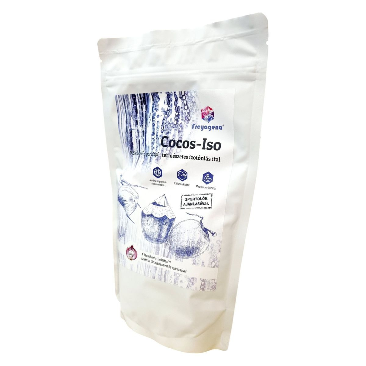 A Freyagena Cocos-Iso egy természetes izotóniás ital, amely kókuszvíz por alapú és ásványi anyagokra standardizált. A termék kálium- és magnézium-laktáttal van dúsítva, és sportolók ajánlásával készült. Nem tartalmaz hozzáadott cukrot vagy édesítőszert, valamint adalékanyagoktól mentes. A kókuszvíz természetes hidratáló hatása mellett elektrolitokkal töltheti fel a szervezetet. A termék könnyen oldódik folyadékban, és kiváló ökológiai alternatíva az alumíniumdobozos kókuszvizekkel szemben. A kálium hozzájárulhat az idegrendszer és izomzat normális működéséhez, valamint a megfelelő vérnyomás fenntartásához, míg a magnézium segíthet a fáradtság csökkentésében és a normál izomműködés fenntartásában.