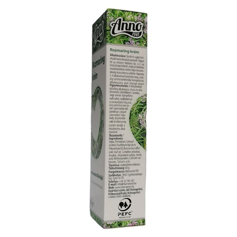 Természetes rozmaring illóolajjal. Fáradt és sajgó testrészek masszírozására. Ápolási céllal ajánljuk reumatikus jellegű ízületi gyulladások időszakában, izomhúzódások, fáradt és sajgó testrészek (derék, váll, könyök, térd, nyak, stb.) masszírozására. Fokozhatja a bőr alatti kötőszövetben az anyagcserét. Alkalmazása gyors hűsítő érzetet kelthet a bőrön. A krém hidratáló hatása a bőrt puhává teheti. Használatát ajánljuk testedzés, sportolás, túrázás és nehéz fizikai munka után is. Mesterséges szín- és illatanyagokat, valamint állati eredetű anyagokat nem tartalmaz.