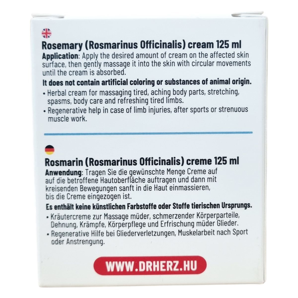 A Dr.Herz Rozmaring krém természetes alapanyagokból készült, főként rozmaringolajat tartalmaz, amely gyulladáscsökkentő és fájdalomcsillapító hatású. Különösen alkalmas reumatikus ízületi gyulladások és végtagfájdalmak enyhítésére. Használata javasolt bemelegítésre, izomláz és kisebb duzzanatok csökkentésére, valamint fáradt, fájó izomzat frissítésére és regenerálására sportsérülések, izommunka után. Nem tartalmaz mesterséges színezéket vagy állati eredetű összetevőket, így természetes alternatívát kínál. A krém masszírozva gyorsan beszívódik, nem tartalmaz mesterséges színezéket és állati eredetű anyagokat, és kerülni kell a szemmel és sérült bőrfelülettel való érintkezést.