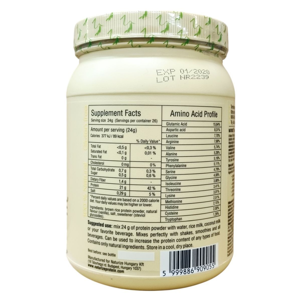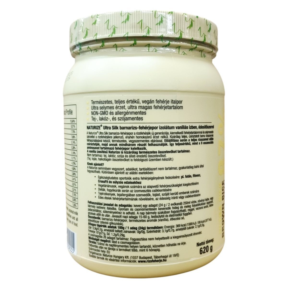 A Naturize® Ultra Silk barnarizs-fehérjepor a rizsfehérjék új generációja, mely kizárólag csíráztatott barna rizsszemekből készül természetes, vegyszermentes eljárással. A termék teljes értékű fehérjét tartalmaz, amely az összes esszenciális aminosavat magában foglalja, így teljes fehérjeforrásnak számít. Finom, selymes állagú, ami eltér a hagyományos rizsfehérjék enyhén homokszerű érzetétől. A vaníliás ízesítés természetes összetevőkkel készült, és édesítőszerként steviol-glikozidokat tartalmaz. A termék alkalmas sportolók, vegetáriánusok, vegánok és tej- vagy szójaérzékenyek számára. Kiválóan használható italokhoz, turmixokhoz, süteményekhez vagy egyéb ételek fehérjetartalmának növelésére. Nettó tömege 620 g, ami 26 adag fehérjeporral egyenértékű, a termék fogyasztása nem helyettesíti a kiegyensúlyozott étrendet és életmódot.