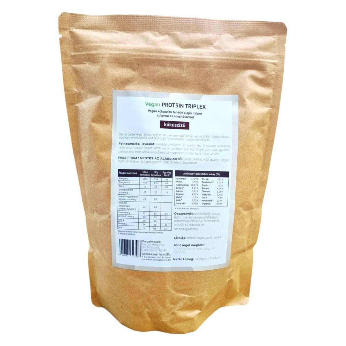 A Vegan PROT3IN TRIPLEX egy kókuszízű, vegán fehérje alapú italpor, amely barnarizs-, borsó- és kendermagfehérje egyedülálló kombinációját tartalmazza. Könnyen emészthető és változatosan felhasználható, például turmixokhoz vagy sütéshez. A termék nem tartalmaz glutént, szóját, tejet, színezéket és tartósítószert, valamint állati eredetű összetevőket. Steviol-glikozidokkal édesített, így cukormentes alternatívát kínálhat. A termék 540 grammos kiszerelésben kapható, amely 18 adag elkészítésére elegendő.