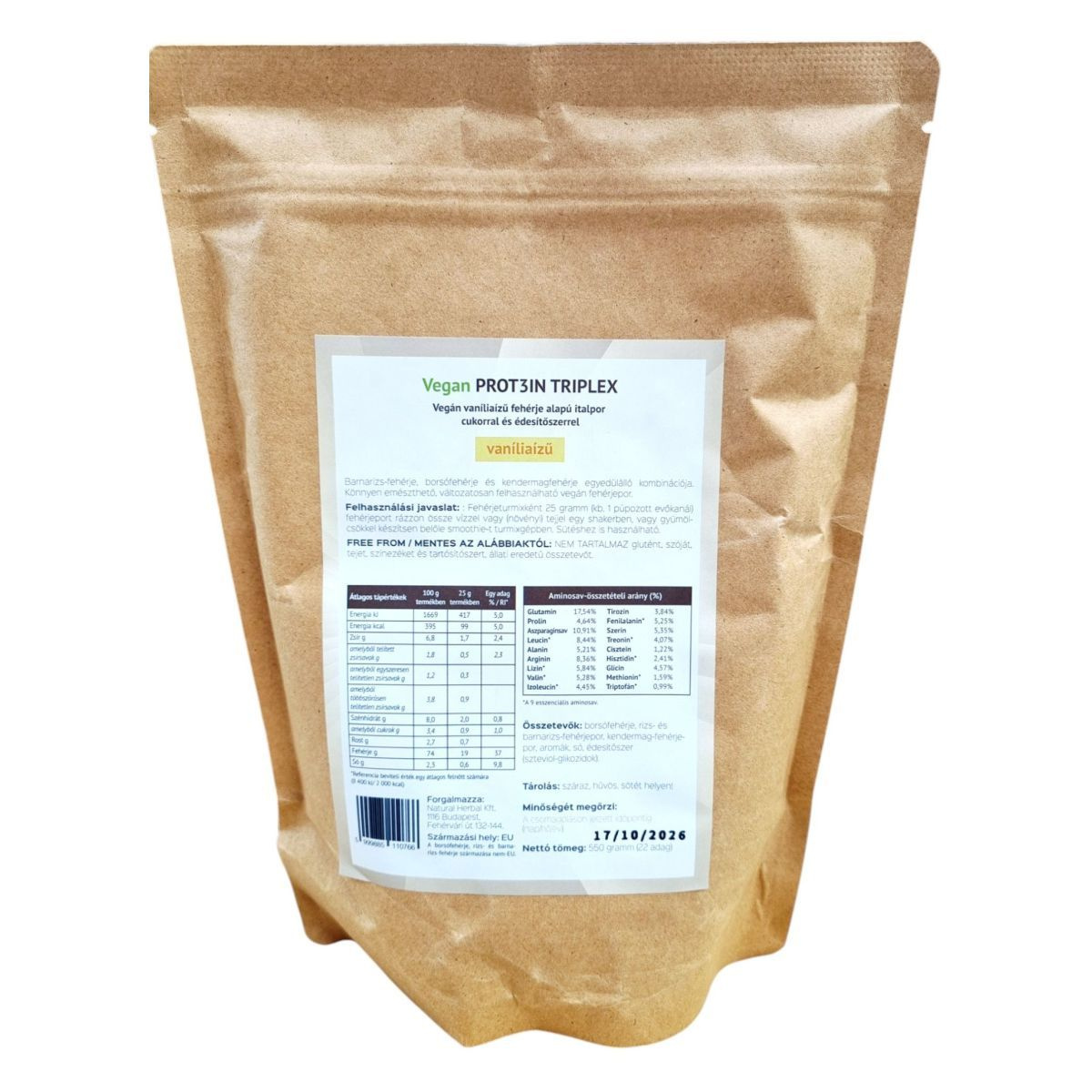 A Vegan PROT3IN TRIPLEX egy prémium minőségű, vegán fehérje alapú italpor, amely barnarizs-, borsó- és kendermagfehérje egyedülálló kombinációját tartalmazza. Az italpor könnyen emészthető, és változatosan felhasználható, például turmixként vagy smoothie-ként. A termék nem tartalmaz glutént, szóját, tejet, színezéket, tartósítószert és állati eredetű összetevőket. A termék steviával édesített, és nem tartalmaz hozzáadott cukrot. Ideális választás lehet azok számára, akik vegán étrendet követnek, vagy akik allergénmentes fehérjeforrást keresnek.