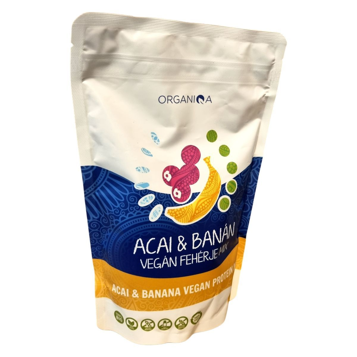 Az Organiqa Acai & Banán Vegán Fehérje Mix egy különleges, 100% bio és vegán fehérje keverék, amely acai és banán ízesítéssel készült. A termék magas fehérjetartalmú, több mint 50%, és nem tartalmaz hozzáadott cukrot, adalékanyagot vagy aromát. Az édesítéshez bio stevia levél őrleményt használtak. Kiváló választás lehet azok számára, akik húsmentesen szeretnék kiegészíteni napi fehérjeszükségletüket, valamint sportolóknak, akik szintetikus szerek nélkül kívánják fejleszteni izmaikat. A termék gluténmentes és szójamentes, és 100% újrahasznosítható tasakban érkezik. Származási helye az EU/nem EU mezőgazdaság, és ellenőrzött ökológiai gazdálkodásból származik.