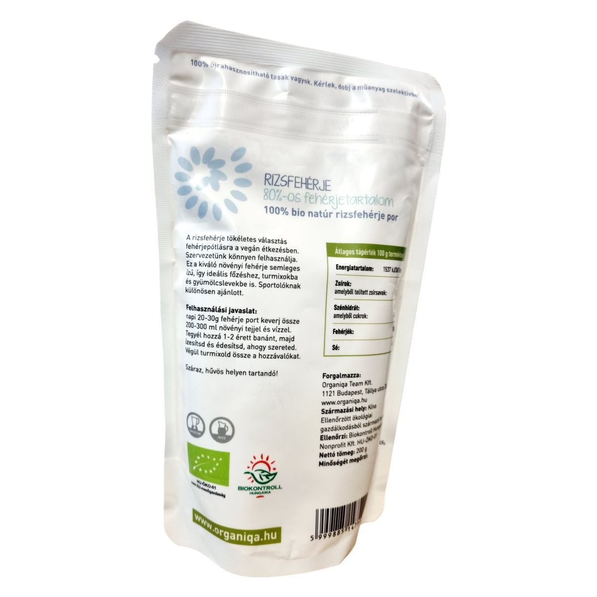 A 100% bio natúr rizsfehérje por Kínából származik, ellenőrzött ökológiai gazdálkodásból. A termék 100% újrahasznosítható tasakban kapható, amelyet a műanyag szelektív hulladékgyűjtőbe kell dobni. A rizsfehérje semleges íze miatt sokféle ételhez és italhoz felhasználható, így ideális választás lehet a vegán étrendet követők számára, akik fehérjepótlásra törekednek. A termék forgalmazója az Organiqa Team Kft., amelynek székhelye Budapesten található.