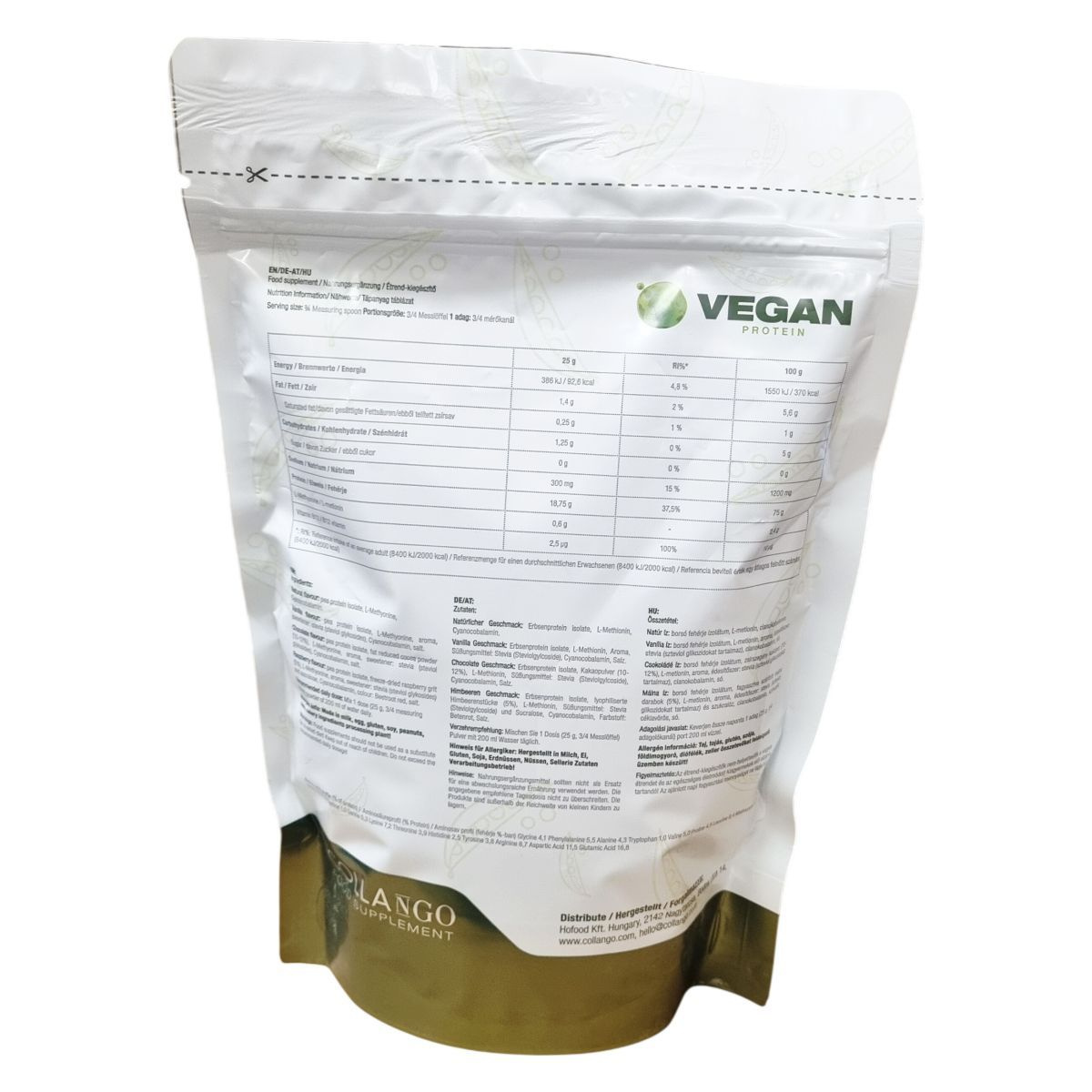A Collango Vegan Protein egy borsófehérje-alapú étrend-kiegészítő, amely természetes és különböző ízekben érhető el, például natúr, vanília, csokoládé és málna. Az összetevők között szerepel az L-metionin és a B12-vitamin, amely a cianokobalamin formájában található meg. Az édesítés steviolglikozidokkal történik, így a termék hozzáadott cukrot nem tartalmaz. Egészséges életmódot támogató vegán étrendhez ajánlott, amely gluténmentes és tejterméket sem tartalmaz. A termék előállítása olyan üzemben történik, ahol tej, tojás, glutén, szója, földimogyoró, diófélék és zeller összetevőket is feldolgoznak. A tápértékadatok szerint magas a fehérjetartalma, valamint B12-vitamin és L-metionin forrása lehet, energiát és fontos tápanyagokat szolgáltatva a szervezetnek.