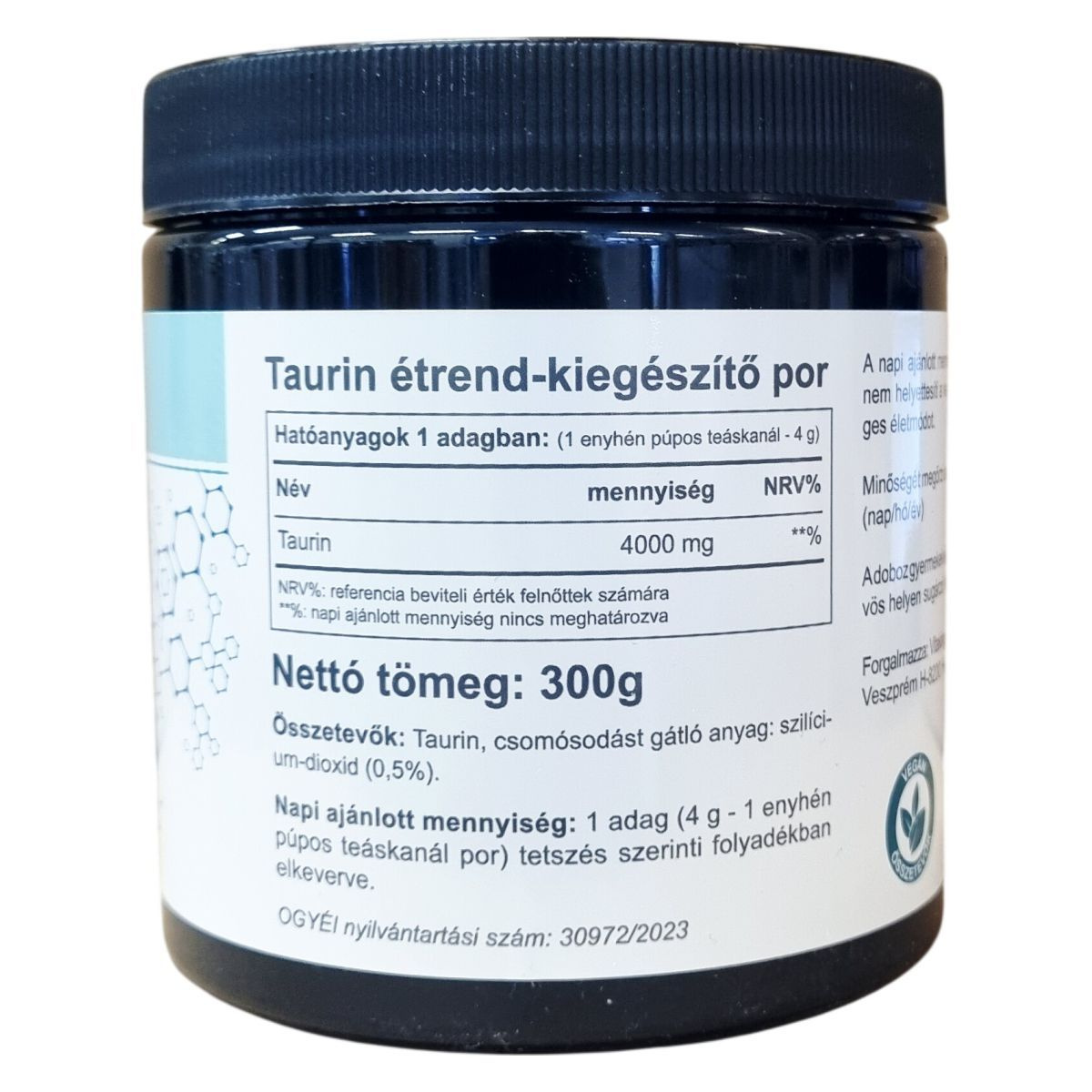 Taurin, csomósodást gátló anyag: szilícium-dioxid (0,5%)