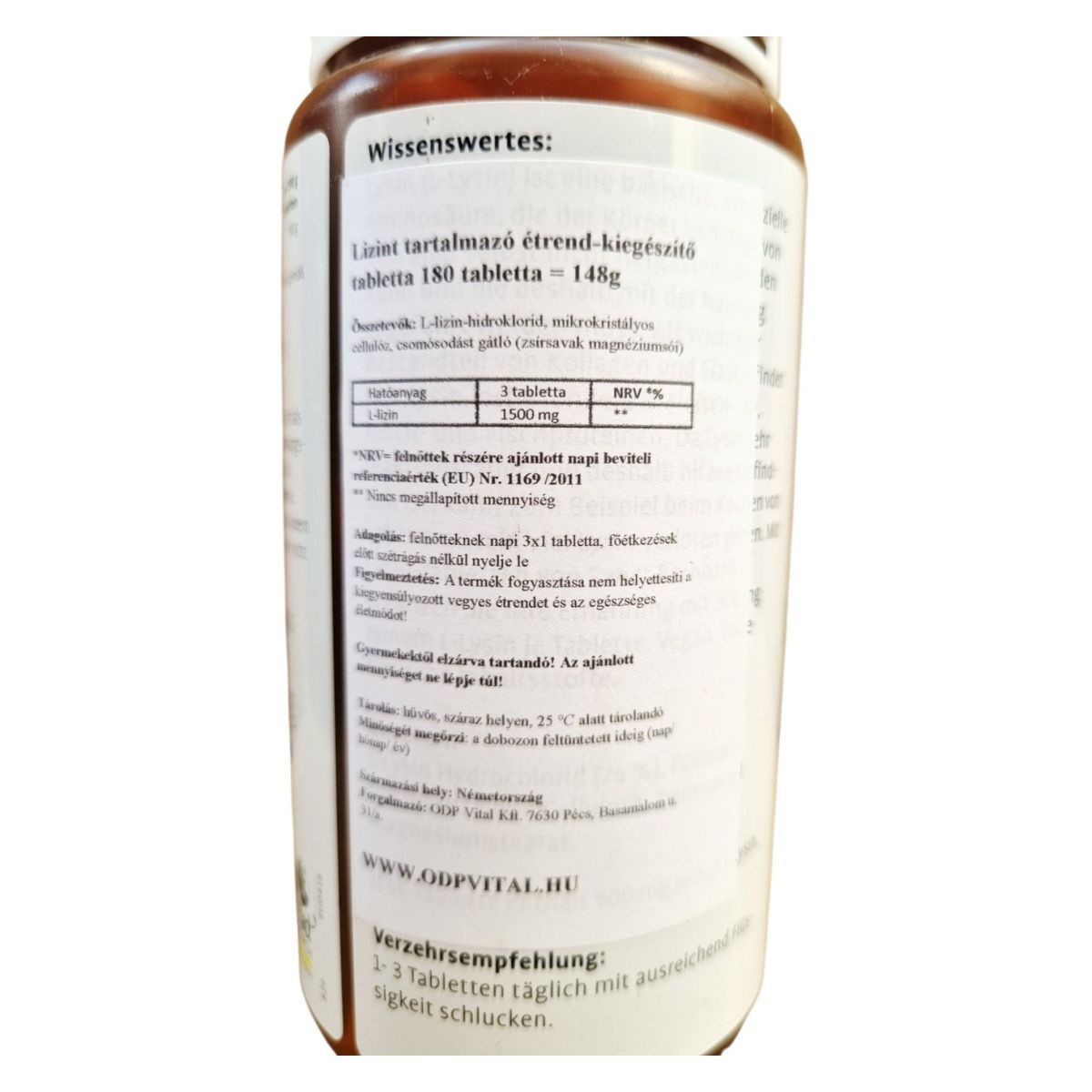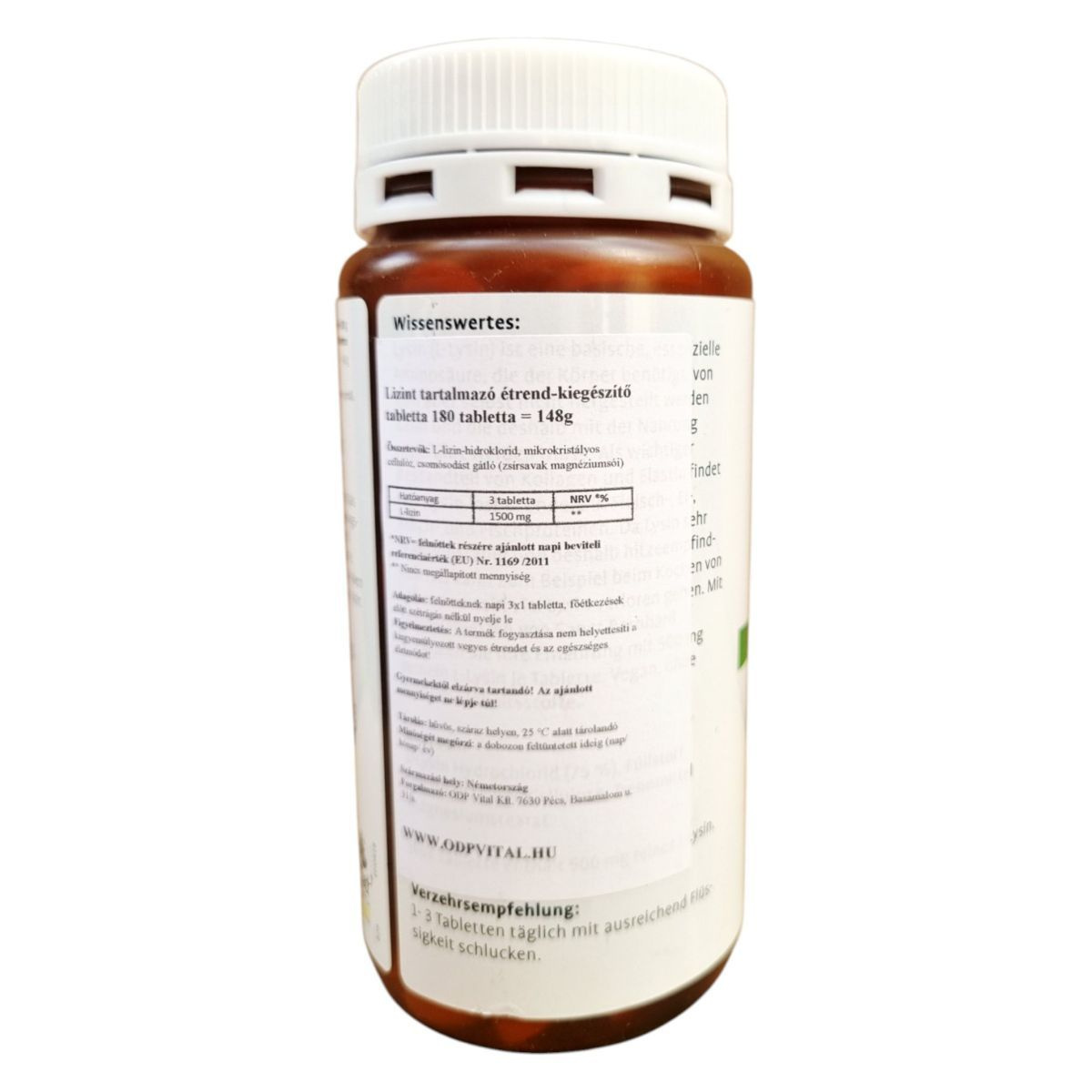 Ez a termék L-lizin-hidrokloridot tartalmaz, amely egy fontos aminosav lehet a szervezet számára. A napi adag három tablettát tartalmaz, ami összesen 1500 mg L-lizint biztosíthat.