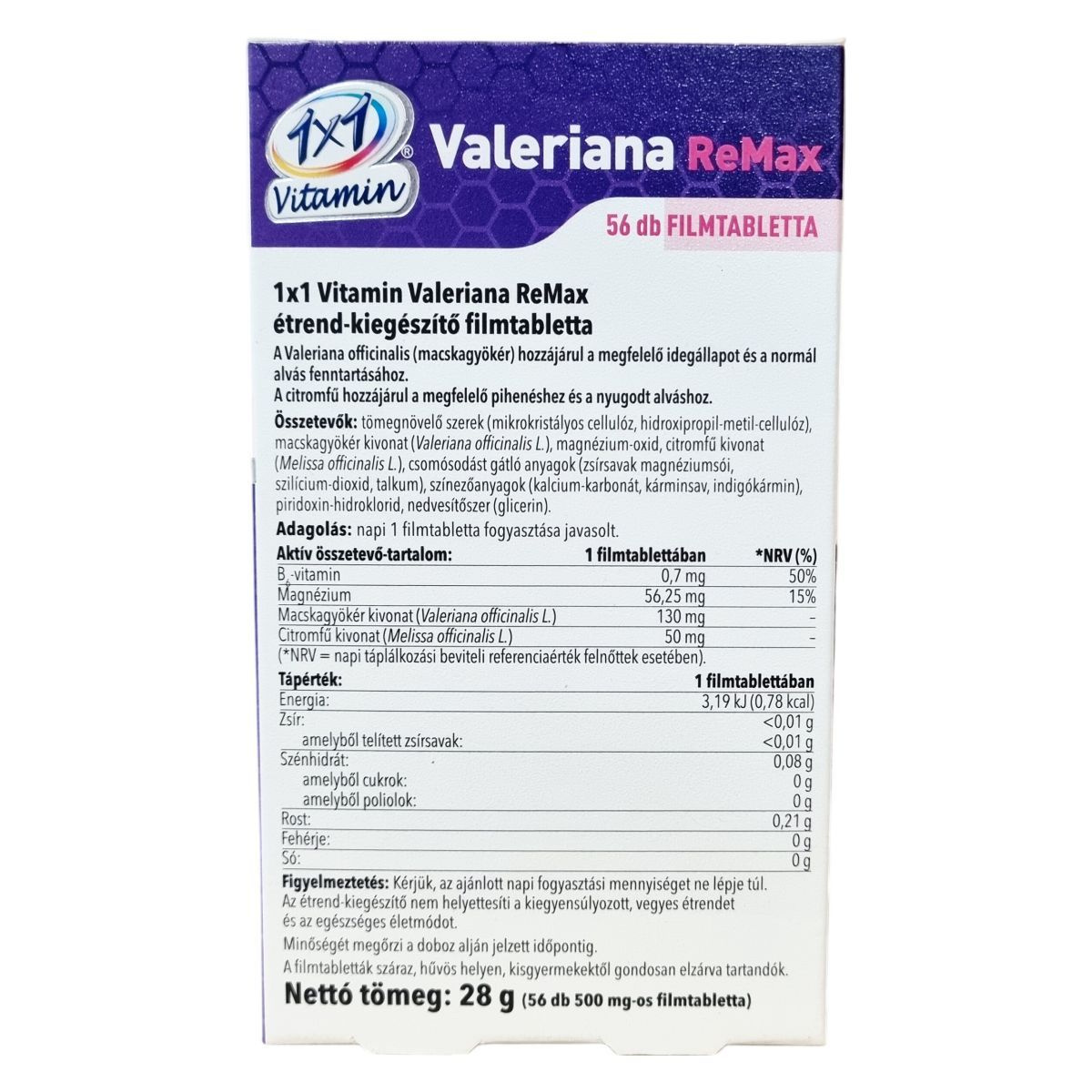 A Valeriana officinalis (macskagyökér) hozzájárulhat a megfelelő idegállapot és a normál alvás fenntartásához, míg a citromfű hozzájárulhat a nyugodt alváshoz és a megfelelő pihenéshez. A termék filmtabletta formában kapható, nettó tömege 28 g, 56 darab 500 mg-os tablettát tartalmaz. Minőségét a doboz alján jelzett időpontig őrzi meg. A termék ellenőrzött minőségű, és az Európai Unió területén készült.