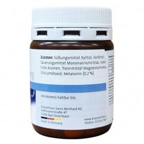 Szopogató tabletta melatoninnal és édesítőszerekkel. 1 tabletta 1 mg melatonint tartalmaz. NRV%: nincs megállapított napi beviteli referenciaérték. Kiszerelés: 120 db tabletta. Németországban gyártva.