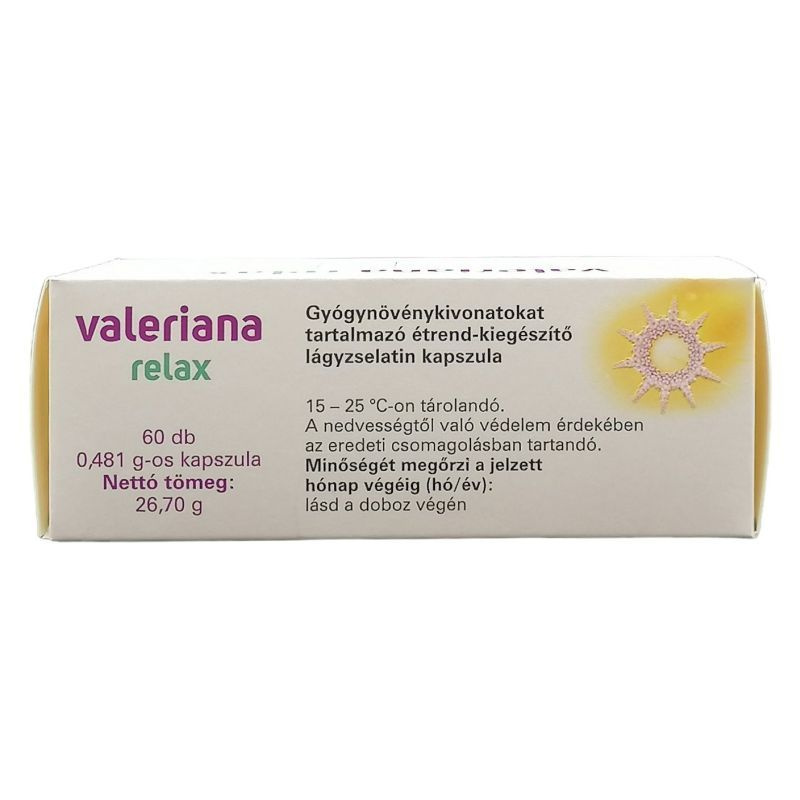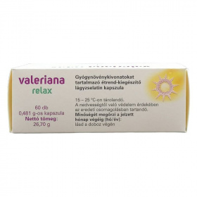 A Valeriana Relax kapszula olyan gyógynövények kivonatát tartalmazza, amelyek hatóanyagai hozzájárulhatnak a normál idegállapot és a lelki egyensúly fenntartásához, valamint a pihentető alváshoz. Hatóanyag napi 1 kapszulában: macskagyökér gyökér kivonat: 60mg, golgotavirág virágos hajtás kivonata: 40 mg, komló toboz kivonat: 40 mg.