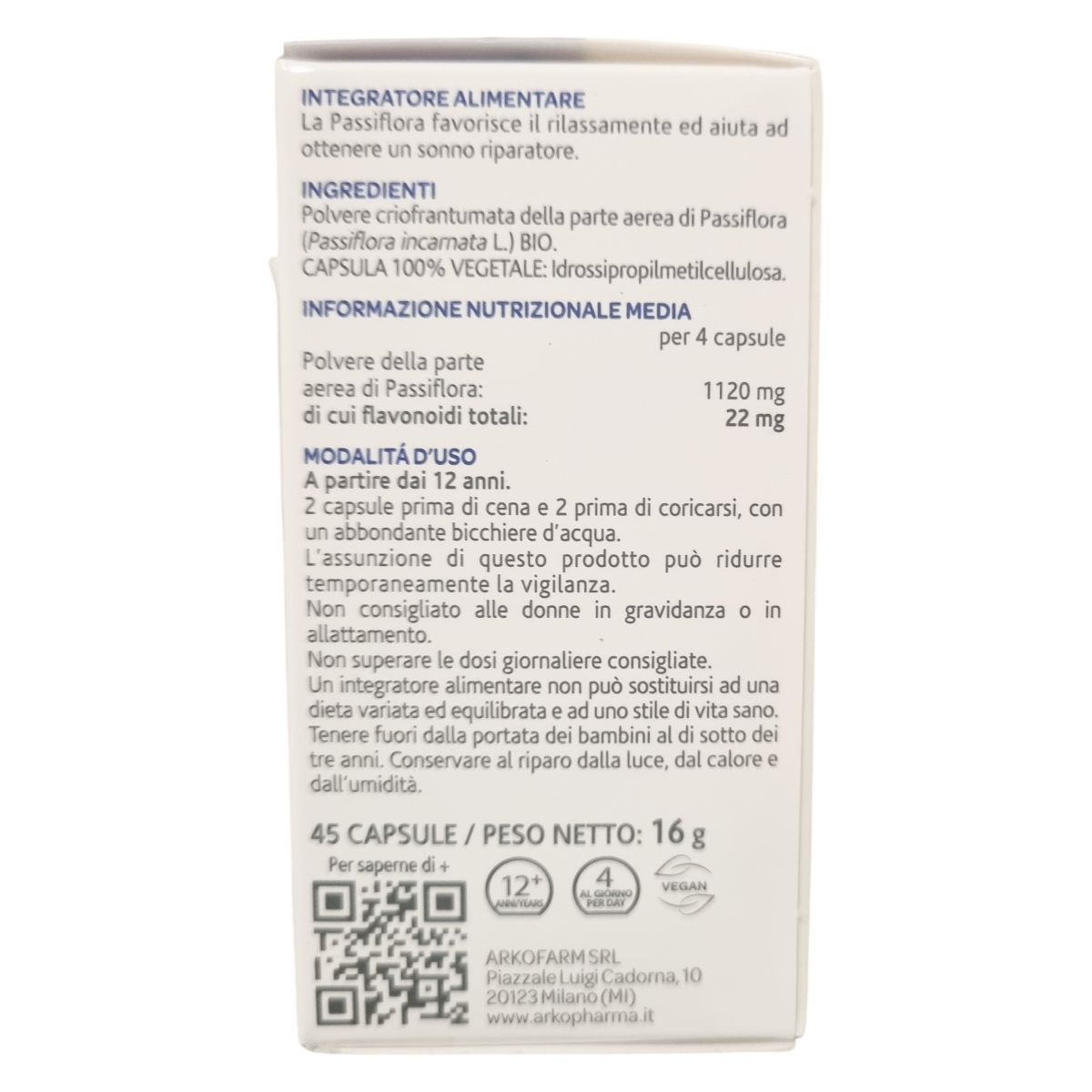 Az Arkocaps® Golgotavirág kapszula bio golgotavirág (Passiflora incarnata L.) föld feletti részét tartalmazó étrend-kiegészítő. A növényi hatóanyag hozzájárulhat a relaxációhoz, a nyugodt pihenéshez és az elalvás elősegítéséhez, valamint segítheti a felizgatott állapotból való megnyugvást. A gyártáshoz fagyasztva őrlési technológiát alkalmaznak, mely biztosítja a hatóanyagok megőrzését, így a készítmény legalább 1,5% flavonoidot, főként vitexint tartalmaz. A kapszula növényi eredetű, hidroxi-propil-metil-cellulóz alapú, így a termék vegán és bio tanúsítvánnyal rendelkezik. Az adagolás 12 éves kortól javasolt, és a termék szedése ideiglenesen csökkenést okozhat az éberségben. Terhes és szoptató nők számára nem ajánlott. A termék nem helyettesíti a kiegyensúlyozott étrendet és az egészséges életmódot. Tárolása száraz, hűvös és sötét helyen ajánlott, gyermekektől elzárva.