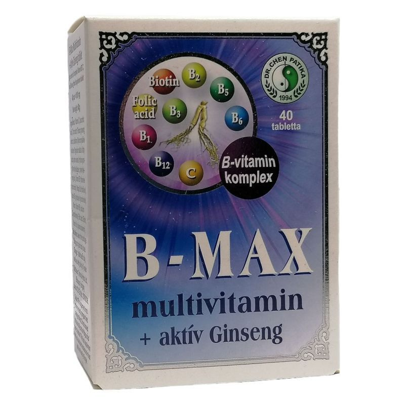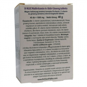 A B-MAX Multivitamint kifejezetten a megnövekedett igénybevétel időszakára fejlesztettük ki, sokszorosára növelt B-vitamin tartalommal (B1: 4545 %, B2: 3571 %, B6: 1428 % a RDA, azaz a napi ajánlott bevitel százalékában). A multivitamin a szervezet számára fontos és megfelelő arányú vitaminokkal támogatja egészségünket, növeli ellenálló-képességünket. Folsav- és biotin-tartalma hozzájárul az idegrendszer normális működéséhez és jelentős szerepet játszik a szénhidrát-, zsír- és fehérje-anyagcserében. Nem utolsósorban hozzájárulnak hajunk, bőrünk, körmünk egészségéhez és szépségéhez. A hozzáadott C-vitamin az immunrendszer megfelelő működéséhez nélkülözhetetlen vitaminforrás, emellett kiváló antioxidáns hatással rendelkezik. A ginseng gyökér természetes hatóanyagai hozzájárulnak a szellemi és fizikai kimerültség leküzdéséhez, valamint keringést serkentő hatásuk révén fokozzák a tabletta egyéb összetevőinek felszívódását és hasznosulását. Naponta 1 tabletta szedése javasolt.