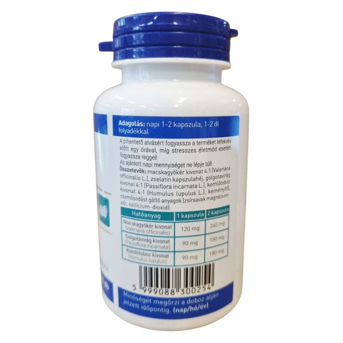 Macskagyökér kivonat (Valeriana officinalis): 1 kapszula - 120 mg, 2 kapszula - 240 mg