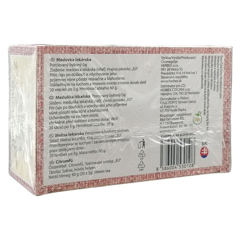 Pozitívan hat kimerültség és alvászavar esetén is. Javítja az emésztést. Összetétel: citromfű levél. Nettó tömeg: 60 g, 20 db 3 g-os filter tasak. Elkészítése: 1 db filter tasakot leforrázunk 0,5 l forró vízzel, majd 10 percig állni hagyjuk.