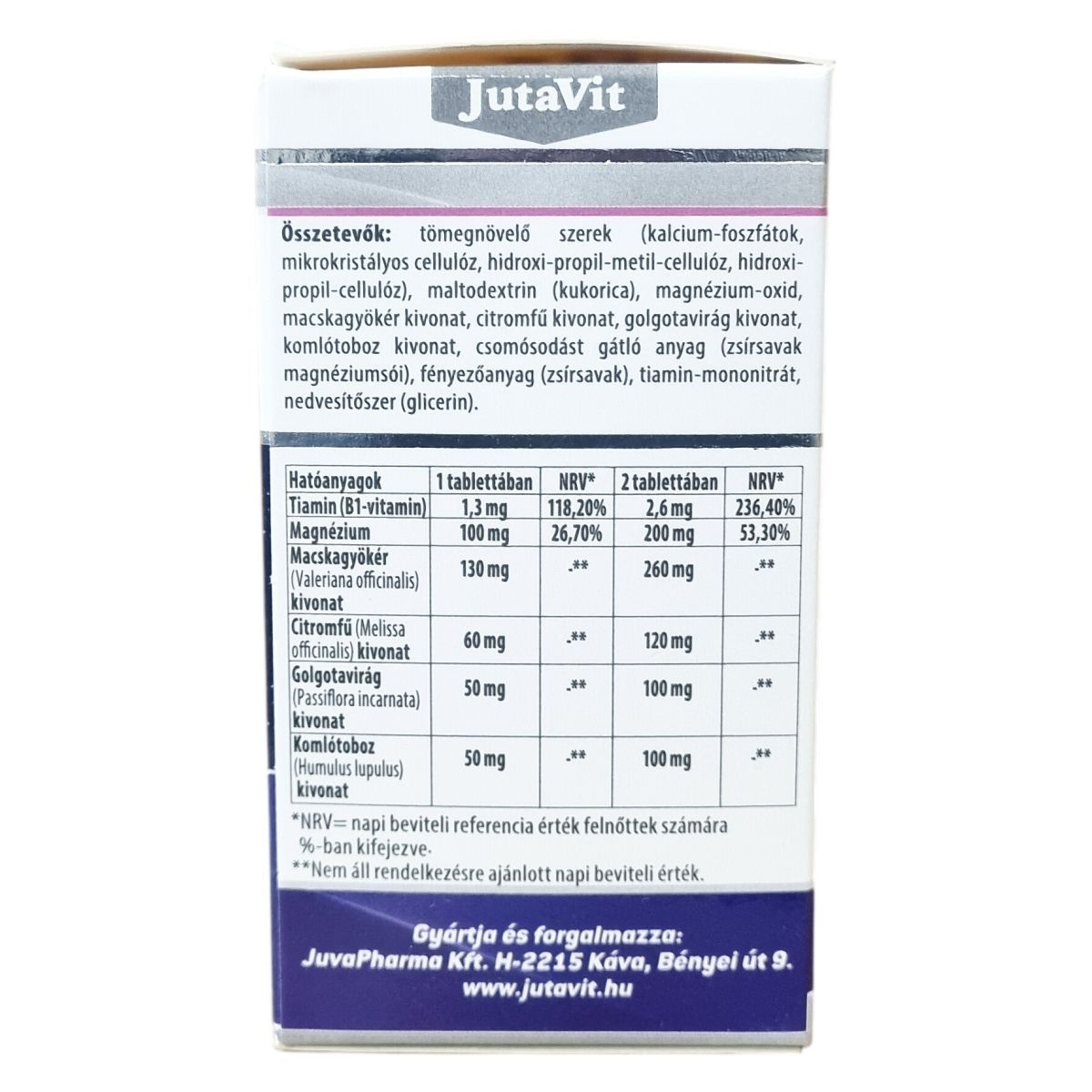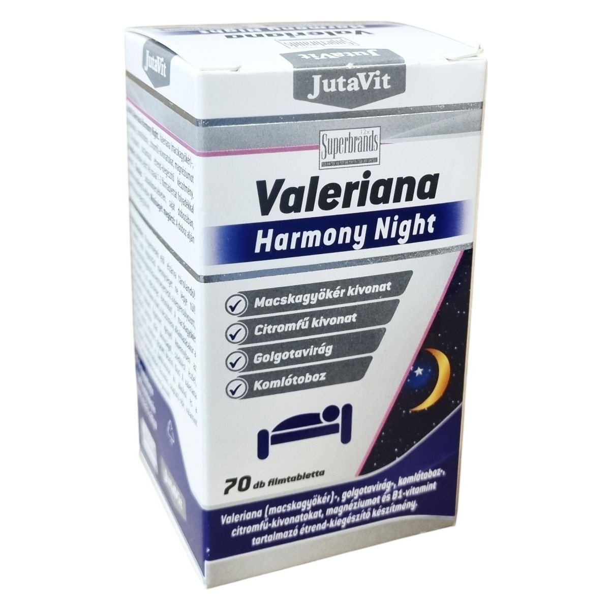 A JutaVit Valeriana Harmony Night egy étrend-kiegészítő készítmény, amely macskagyökér-, golgotavirág-, komlótoboz- és citromfű-kivonatokat, valamint magnéziumot és B1-vitamint tartalmaz. A termék filmtabletta formában, 70 darab kiszerelésben érhető el. A készítmény használatakor ajánlott a lefekvés előtti időszakban 1-2 filmtablettát folyadékkal bevenni. A komponensek megválasztása révén a termék hozzájárulhat a relaxációhoz és a nyugodt éjszakai pihenés támogatásához. A macskagyökér tartalma miatt a használat során fokozott figyelem ajánlott a gépjárművezetés és veszélyes gépek kezelése terén. A készítmény nem helyettesíti a kiegyensúlyozott étrendet és az egészséges életmódot, gyermekek, várandós és szoptató nők számára történő alkalmazása nem javasolt.