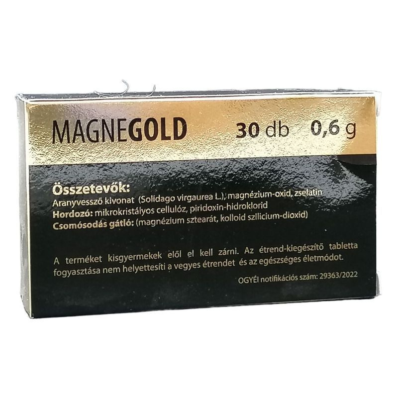 Miért hasznos a Magnegold? Aranyvessző kivonat - Az aranyvessző (solidago virga urea) egy virágos évelő növény, amely gyógynövényként régóta ismert. Több vesekövesség esetén javasolt szer hatóanyaga, mivel kivonatainak vízhajtó (diuretikus), görcsoldó (spasmolyticus), gyulladáscsökkentő (antiflogisztikus), és fájdalomcsillapító (analgetikus) hatása is van. B6-vitamin - A B6-vitaminnak jól ismert a hányingercsillapító hatása, támogatja az immunrendszert, javítja a koncentrálóképességet, emellett - többek között - a magnézium hasznosulását is elősegíti. Az oxalat anyagcserére gyakorolt hatása miatt pedig szintén szerepet játszhat a vesekő kialakulásának megelőzésében. Magnézium - A magnézium a szervezet számos anyagcsere-folyamatában nélkülözhetetlen. Mivel többek között segíti az izmok elernyedését, ezért görcsoldó hatása van, emellett jó hatású a szívműködésre, a vérnyomásra és az idegi működésre. A vesekövek megelőzésében azért fontos, mert csökkenti a calcium oxalat (ami az egyik leggyakoribb kőfajta alkotóeleme) mennyiségét, ezáltal gátolva a vesekő kialakulását.