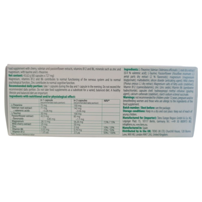 L-theanin, valeriána (Valeriana officinalis L.) gyökér száraz kivonat (0,4% valeriánsav), L-taurin, passióvirág (Passiflora incarnata L.) száraz kivonat (2% flavonoid), magnézium-biszglicinát, maltodextrin, csomósodást gátló anyag (szilícium-dioxid), vadcseresznye (Prunus cerasus L.) kivonat, zsírsavak magnéziumsói, B12-vitamin (cianokobalamin), cink-oxid, B6-vitamin (piridoxin-hidroklorid), kapszulahéj: hidroxipropil-metil-cellulóz (bevonatanyag), kalcium-karbonát (stabilizátor), nátrium-oktenil-szukcinátos keményítő.