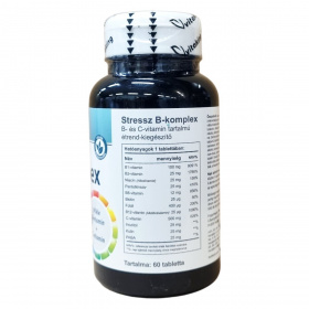 A Stressz B-komplex étrend-kiegészítő kilencféle B-vitamint és C-vitamint tartalmaz, amelyek hozzájárulhatnak az idegrendszer normál működéséhez, a pszichológiai funkciók fenntartásához, valamint a fáradtság és kifáradás csökkentéséhez. A termék metilkobalamint, kalcium-L-metil-folátot és biotint is tartalmaz, amelyek kulcsfontosságúak lehetnek a test megfelelő működéséhez. Vegán tabletta formájában kapható, amely napi egy tabletta bevételével ajánlott beépíteni az étrendbe. A készítmény összetevői között szerepelnek olyan anyagok is, mint az aszkorbinsav, tiamin-mononitrát, riboflavin és para-aminobenzoesav, valamint különféle tömegnövelő, stabilizáló, csomósodást gátló és színező anyagok. A terméket száraz, hűvös és fénytől védett helyen kell tárolni, gyermekektől elzárva. Az étrend-kiegészítő nem helyettesíti a változatos étrendet és az egészséges életmódot.