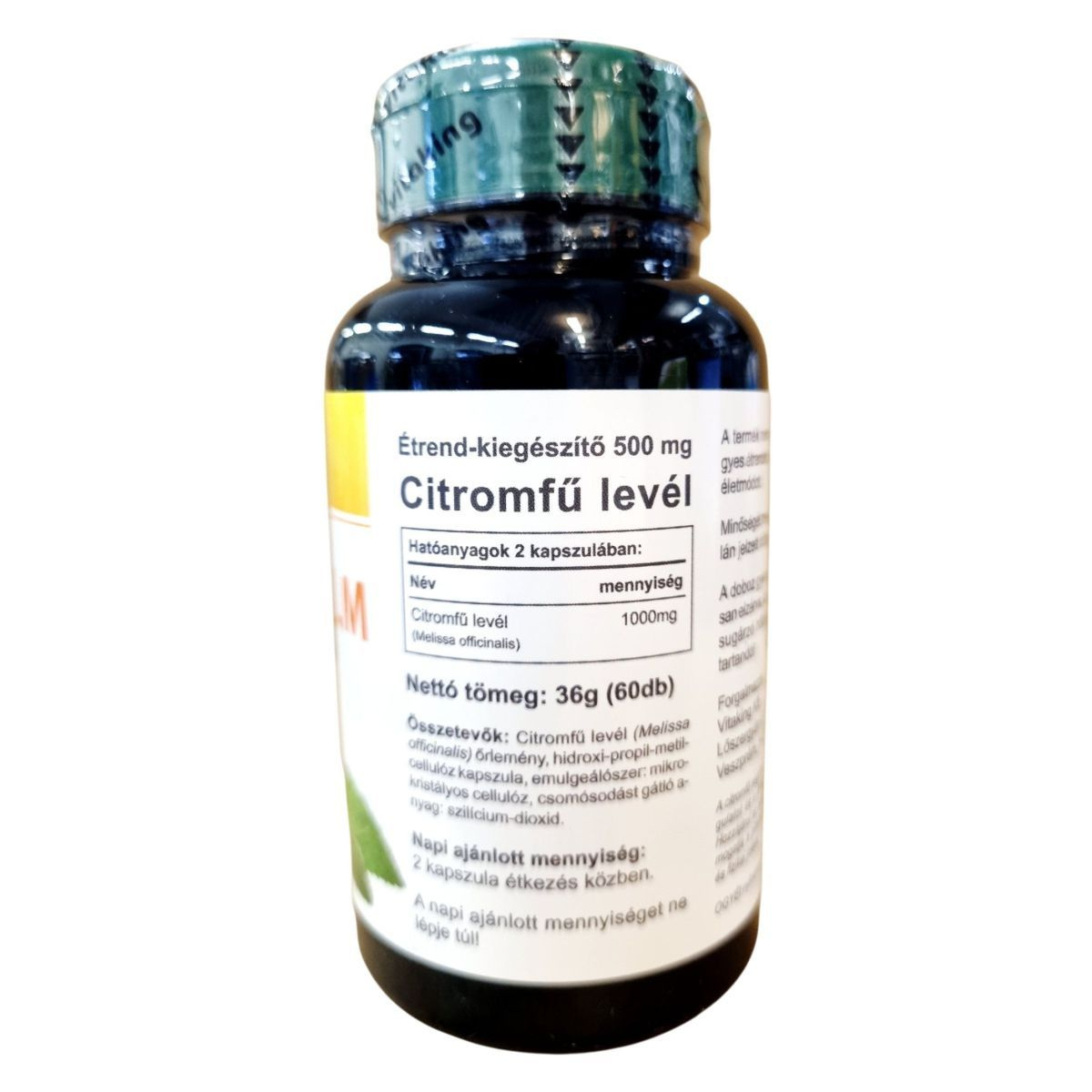 A Vitaking Lemon Balm egy természetes gyógynövény alapú étrend-kiegészítő, amely 60 kapszulát tartalmaz. A fő összetevője a citromfű levél, amely segíthet fenntartani a pozitív hangulatot és a kognitív képességeket. A termék GMP minősítéssel rendelkezik, és az OGYÉI engedélyezte. A citromfű hozzájárulhat az optimális relaxációhoz, a mentális és fizikai jóléthez, valamint a mindennapi jóléthez. A termék használata során fontos, hogy ne lépjük túl a napi ajánlott mennyiséget, és tartsuk be a tárolási előírásokat.