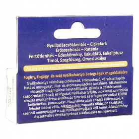 Nyálkahártya vérbőség csökkentő, érösszehúzó, vérzéscsillapító hatású anyagokat, illat- és aromaanyagokat tartalmaz. Alkalmazása elősegítheti a szájhigiéné helyreállítását, gátolhatja a baktériumok szaporodását a száj és légutak nyálkahártyáján, csökkentheti az irritáció okozta nyálkahártya elváltozás tüneteit és a fogínysorvadást kísérő kellemetlen panaszokat. Használata után a szájíz kellemessé, a lehelet üdévé válhat. Hatóanyagok: Cickafark, Ratánia, Édeskömény, kakukkfű, eukaliptusz, timol,szegfűszeg, orvosi zsálya.