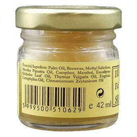 Összetevők: eukaliptusz, borsmenta, szegfűszeg, levendula illóolajok, kakukkfű olaj, fahéj olaj, metil-szalicilát, kámfor, mentol, sárga méhviasz, pálmazsír.