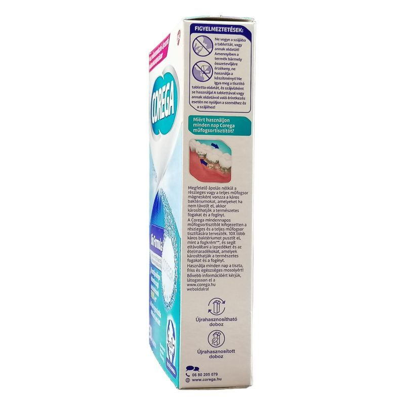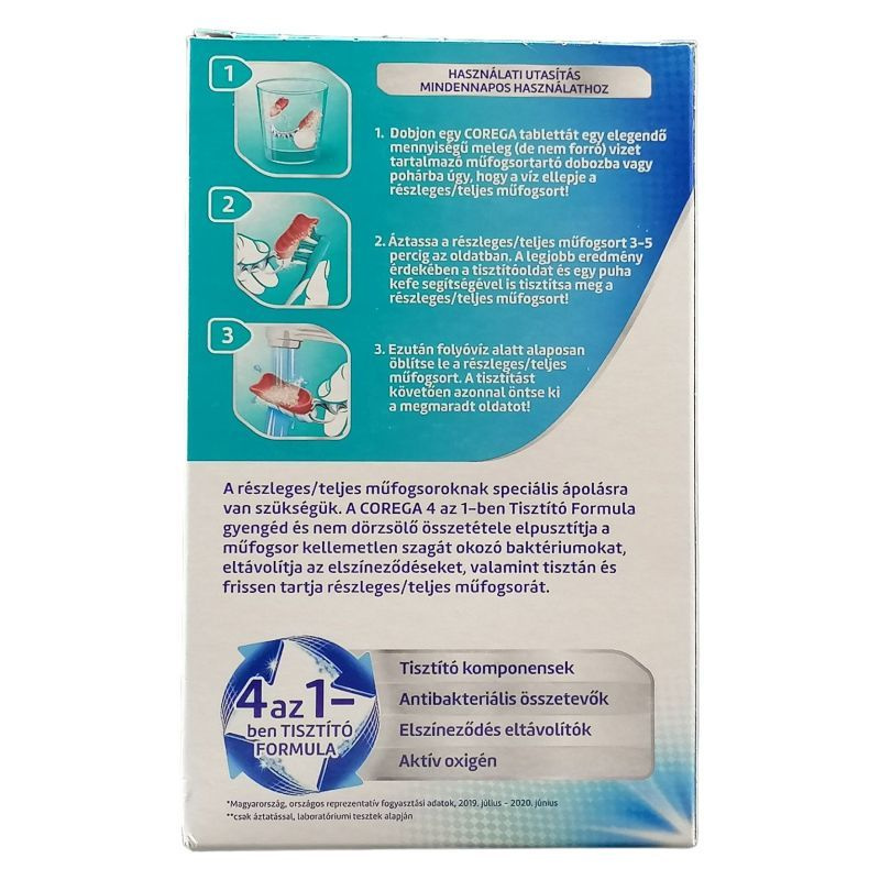 Corega Tabs biológiai hatóanyagú tisztítószer eltávolítja a foltokat és lepedékeket.