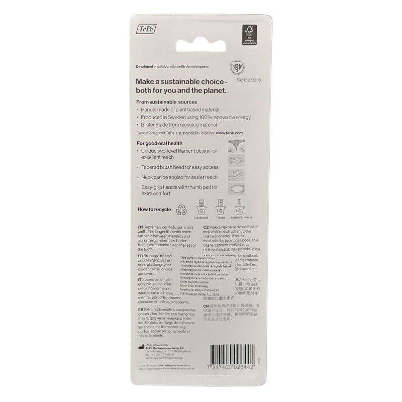 A TePe Supreme fogkefe speciálisan kialakított nyéllel készült és hüvelykujj támasztóval. Innovatív, extra puha sörtéi kétféle hosszúságúak: a rövidek tökéletesen megtisztítják a fog felületét, míg a hosszabbak elérik a fogínyt és a fog közötti réseket.