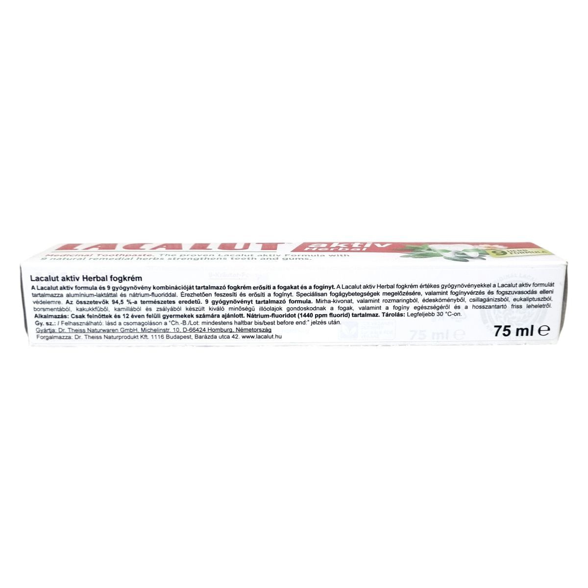 A Lacalut aktiv Herbal fogkrém a jól bevált Lacalut aktiv formulát és kilenc értékes gyógynövényt kombinál, melyek természetes eredetű összetevők 94,5%-át teszik ki. A termék értékes gyógynövényekkel, mint a mirha-kivonat és rozmaring, édeskömény, csillagánizs, eukaliptusz, borsmenta, kakukkfű, kamilla és zsálya illóolajai gondoskodik a fogak és a fogíny egészségéről, valamint hosszan tartó friss leheletet biztosít. Speciálisan fogágybetegségek megelőzésére, fogínyvérzés és fogszuvasodás elleni védelemre fejlesztették ki. A termék alumínium-laktáttal és nátrium-fluoriddal van gazdagítva, így hatékonyan erősíti a fogakat és feszesíti a fogínyt. Csak felnőttek és 12 év feletti gyermekek részére ajánlott használatra.