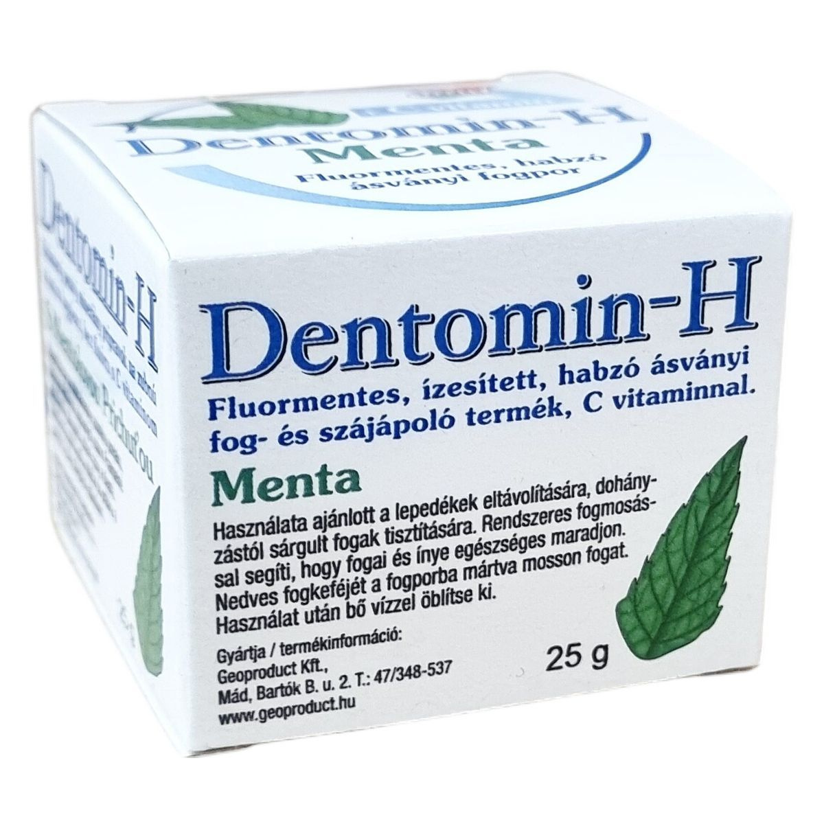 A Dentomin-H menta ízesítésű, fluort nem tartalmazó ásványi fogpor, amely rendszeres használattal támogatja a fogak és az íny egészségét. Különösen ajánlott a dohányzás miatt elszíneződött fogak tisztítására és a fogkő eltávolítására. A termék habzó, így alapos tisztítást biztosít. Tartalmaz továbbá C vitamint, amely hozzájárulhat a szájüreg egészségéhez. A fogmosás során a nedves fogkefét a porba mártva használjuk, majd a száj alapos öblítésével zárjuk a folyamatot. A csomagolás 25 gramm fogport tartalmaz.