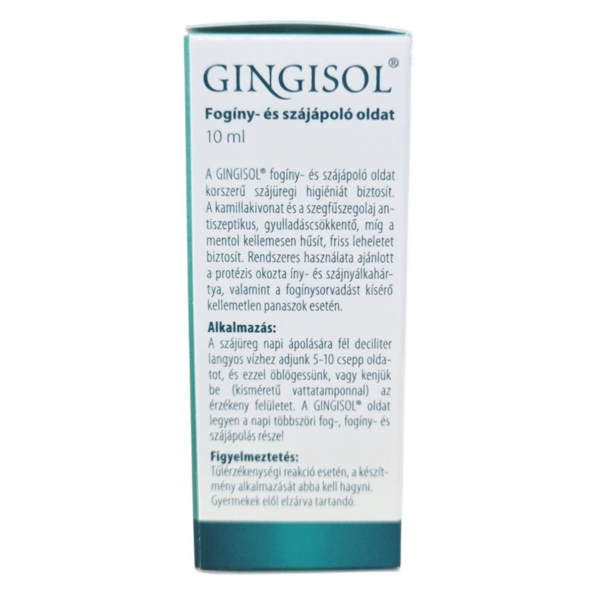 A GINGISOL fogíny- és szájápoló oldat a kamillakivonat és szegfűszegolaj antiszeptikus és gyulladáscsökkentő hatásával, valamint a mentol hűsítő tulajdonságával járulhat hozzá a szájüreg egészségéhez. Rendszeres használata ajánlott protézis okozta íny- és szájnyálkahártya problémák, valamint fogínysorvadás esetén. A termék alkalmazása során ügyelni kell az esetleges túlérzékenységi reakciókra, és gyermekek elől elzárva tartandó. A termék szobahőmérsékleten tárolandó, és a gyártó BGB Interherb Kft.
