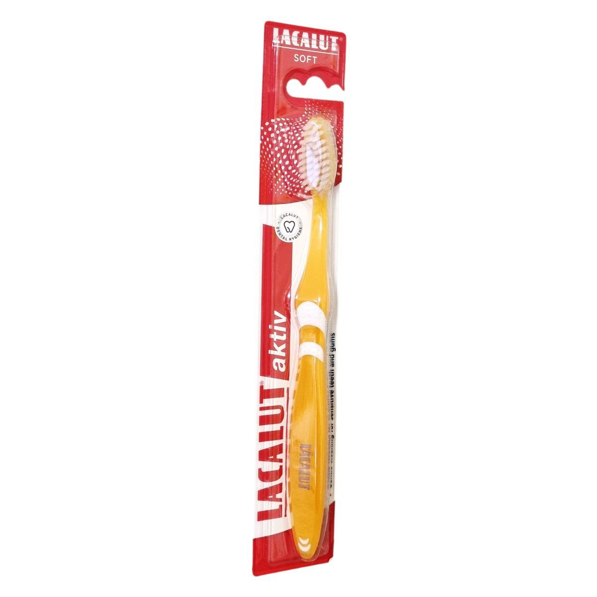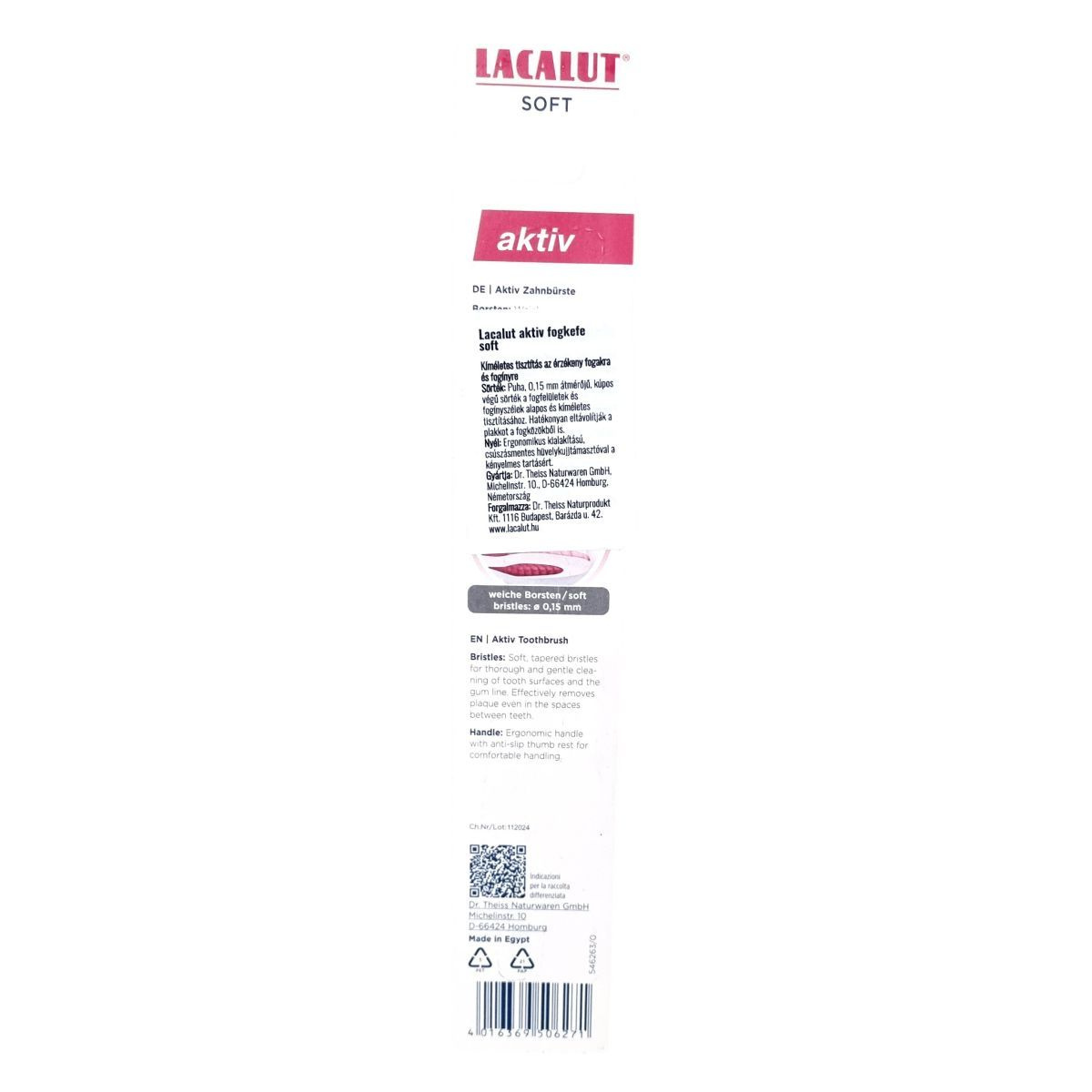 A Lacalut Soft aktív fogkefe puha, 0,15 mm átmérőjű, kúpos végű sörtékkel rendelkezik, amelyek alapos és kíméletes tisztítást biztosítanak a fogfelszínen és a fogínyszéleken, beleértve a fogközöket is. Ergonomikus, csúszásmentes markolata hüvelykujjtámasztóval segíti a kényelmes fogást. A terméket Németországban gyártják, és a Lacalut márka a fogápolás érzékeny igényeit célozza meg.